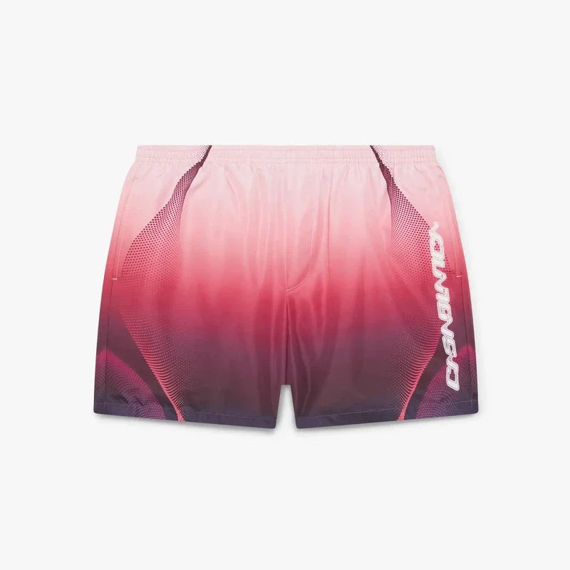 Die Aubergine-Farbverlauf-Print-Shorts zeichnen sich durch ein raffiniertes Design aus und präsentieren das saisonale Farbverlaufsmuster, das die satten Farben der Aubergine nachahmt. Abgerundet durch einen elastischen Bund, einen innenliegenden Kordelzug, Seitentaschen in den Beinen, ein Futter und kontrastierende Saumdetails.