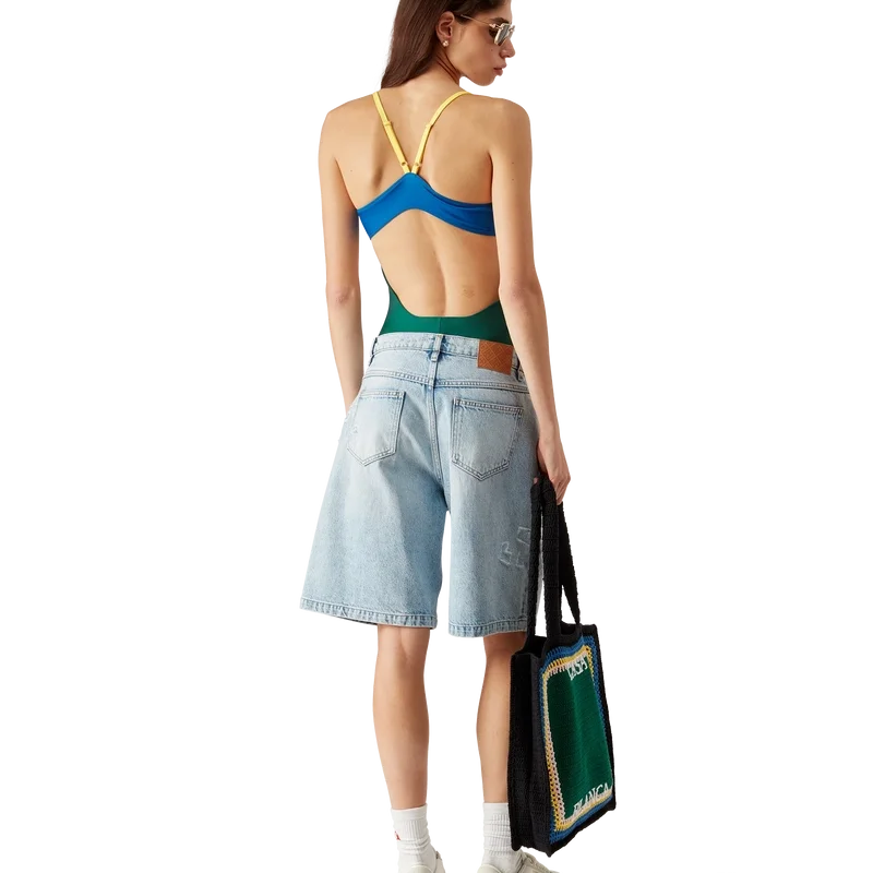Der Colourblock-Badeanzug ist aus einem atmungsaktiven technischen Badestoff gefertigt und mit dem Casablanca-Logo des Hauses auf der Brust versehen. Abgerundet durch Kontrastbesätze, hoch geschnittene Beine, einen Rundhalsausschnitt und einen Cut-Out am Rücken.