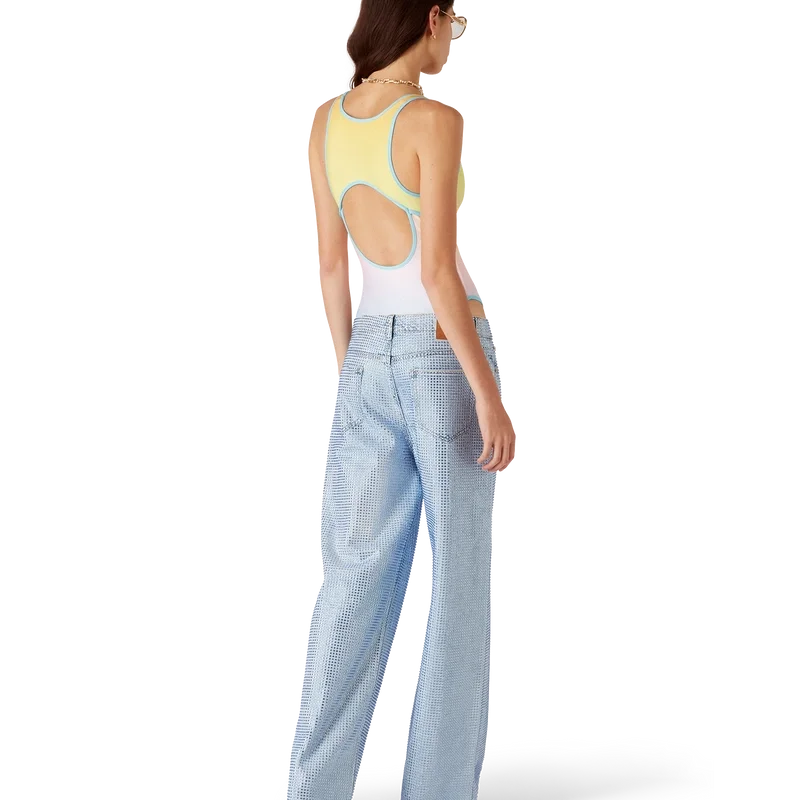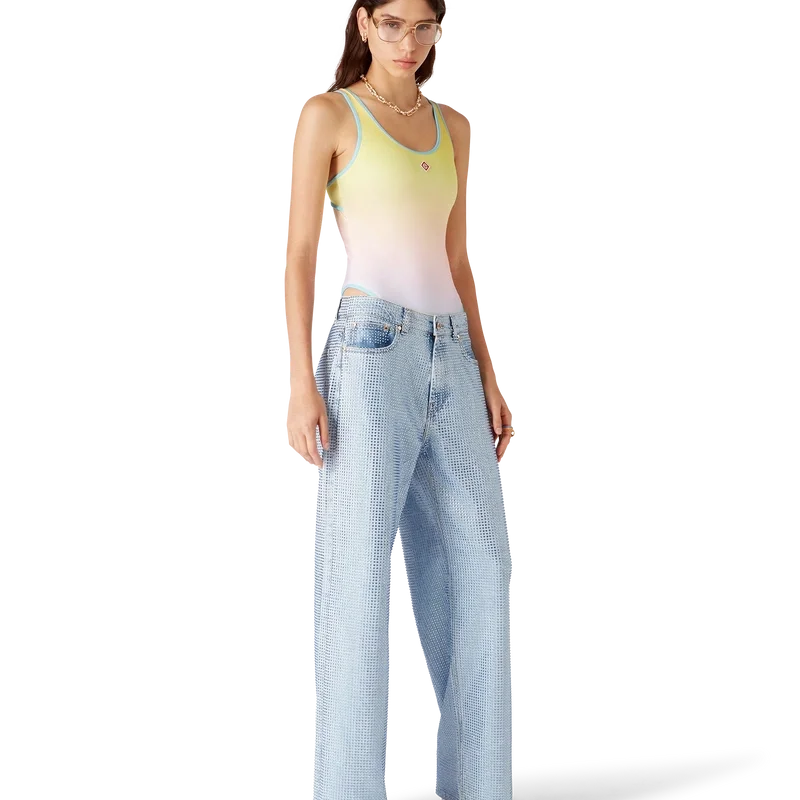 Der Gradient-Badeanzug ist ein bedrucktes Design aus atmungsaktivem, technischem Badestoff mit einer zurückhaltenden Farbpalette aus Blau, Aqua, Rosa und Gelb in einem Farbverlauf. Abgerundet wird er durch kontrastfarbene Besätze, hoch geschnittene Beine, einen U-Ausschnitt, einen Ausschnitt am Rücken und das charakteristische Rautenlogo des Hauses auf der Brust.