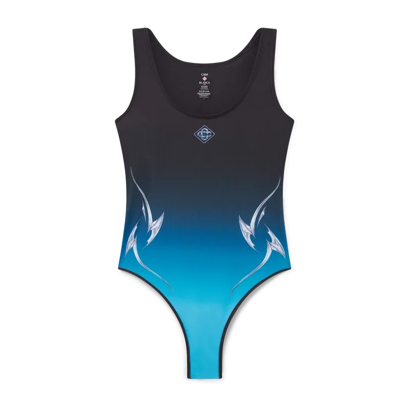 Der Blades-Badeanzug ist ein bedrucktes Design aus atmungsaktivem technischem Badestoff, dessen Motiv mit dem Kontrast zwischen zwei gegensätzlichen Empfindungen spielt – der Schärfe der Klinge und dem kalten, silbernen Chrom, kontrastiert mit der Wärme der Natur, wie den kräftigen Rosa- und Rottönen einer Orchideenblüte. Das Hinzufügen von Wasser verleiht dem Design eine frische, klare Note. Abgerundet wird der Look durch hoch geschnittene Beine, einen U-Ausschnitt, einen Ausschnitt am Rücken und das charakteristische Diamant-Logo des Hauses auf der Brust.