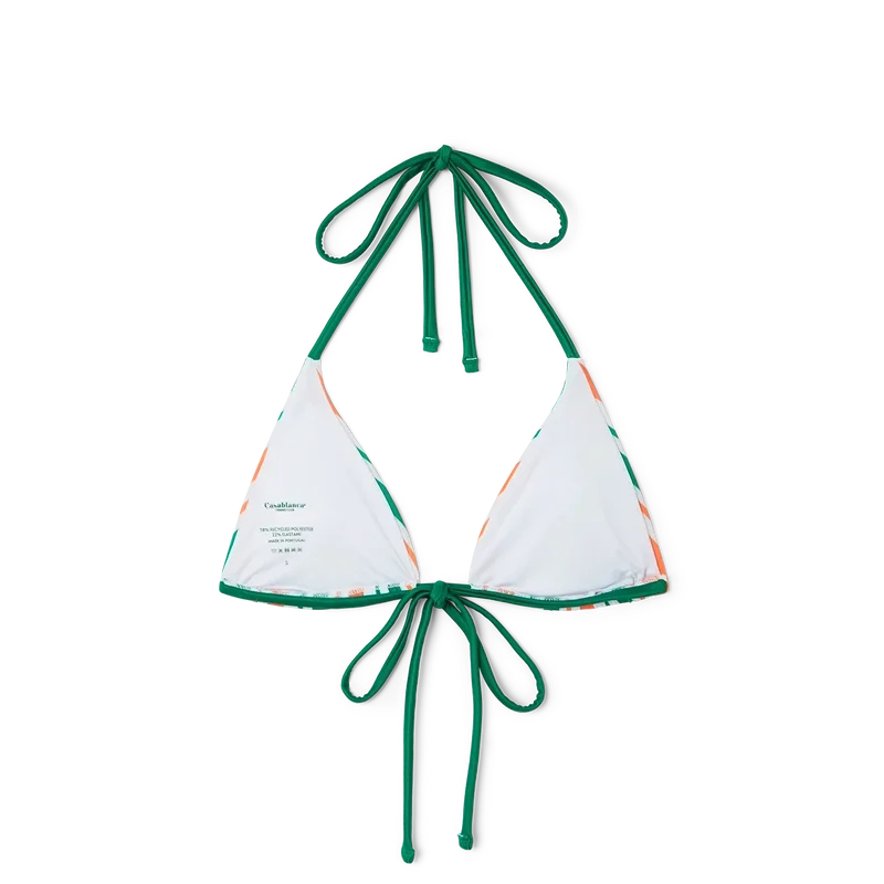 Das gestreifte String-Bikini-Oberteil ist ein dreieckiges Modell in saisonalen Farben mit grünen Bändern zum Binden am Nacken und am Rücken. Dieses Teil verfügt über herausnehmbare Polster und ist dazu gedacht, mit dem passenden Unterteil getragen zu werden.
