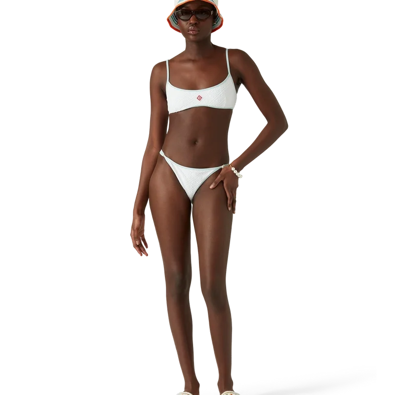 Das Jacquard-Monogram-Bikini-Oberteil ist ein bedrucktes Modell aus einem atmungsaktiven Polyester-Mischgewebe, das mit dem charakteristischen Diamond Monogram des Hauses verziert ist. Abgerundet durch hellblaue Spaghettiträger und Besätze – dieses Modell ist dazu gedacht, zusammen mit dem passenden Bikini-Unterteil getragen zu werden.