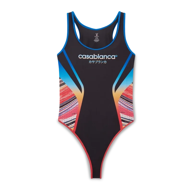 Der Marble-Badeanzug ist ein bedrucktes Modell aus atmungsaktivem, technischem Badestoff mit dem Casablanca-Logo des Hauses auf der Brust und einem mehrfarbigen Marmor-Effekt-Motiv an den Seitenteilen. Abgerundet durch hoch geschnittene Beine, einen U-Ausschnitt, einen Ausschnitt am Rücken sowie blaue und orangefarbene Zierdetails.