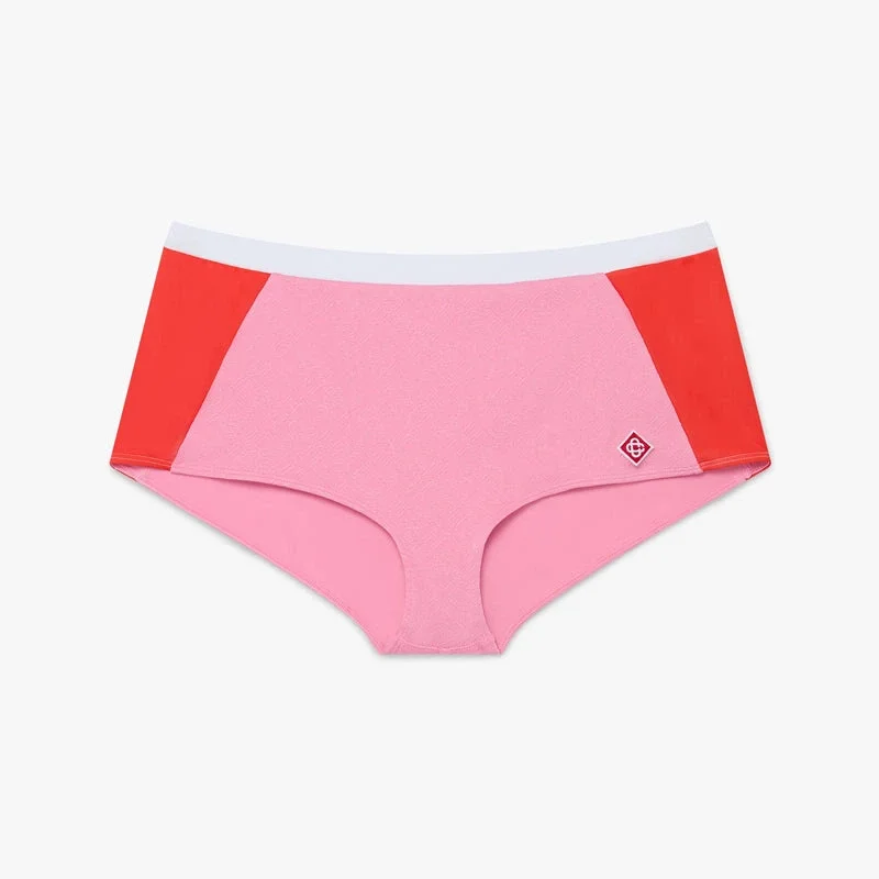 Die rosa Monogram-Bikini-Shorts sind ein raffiniertes Design mit dem charakteristischen Monogram-Muster des Hauses in einer lebhaften Farbgebung aus Rosa, Rot und Weiß. Abgerundet durch einen weißen Bund und rote Streifen an den Seiten. Entworfen, um mit dem passenden rosa Monogram-Rash-Top getragen zu werden.