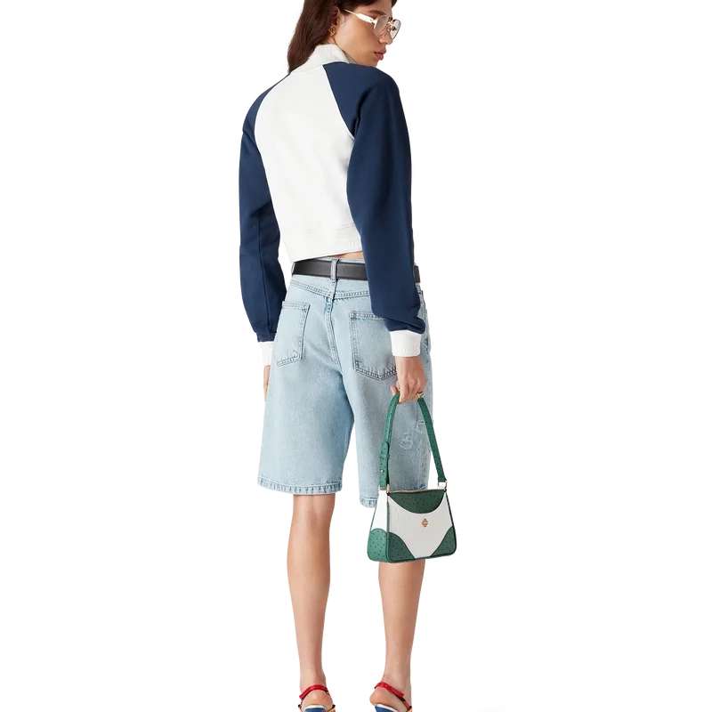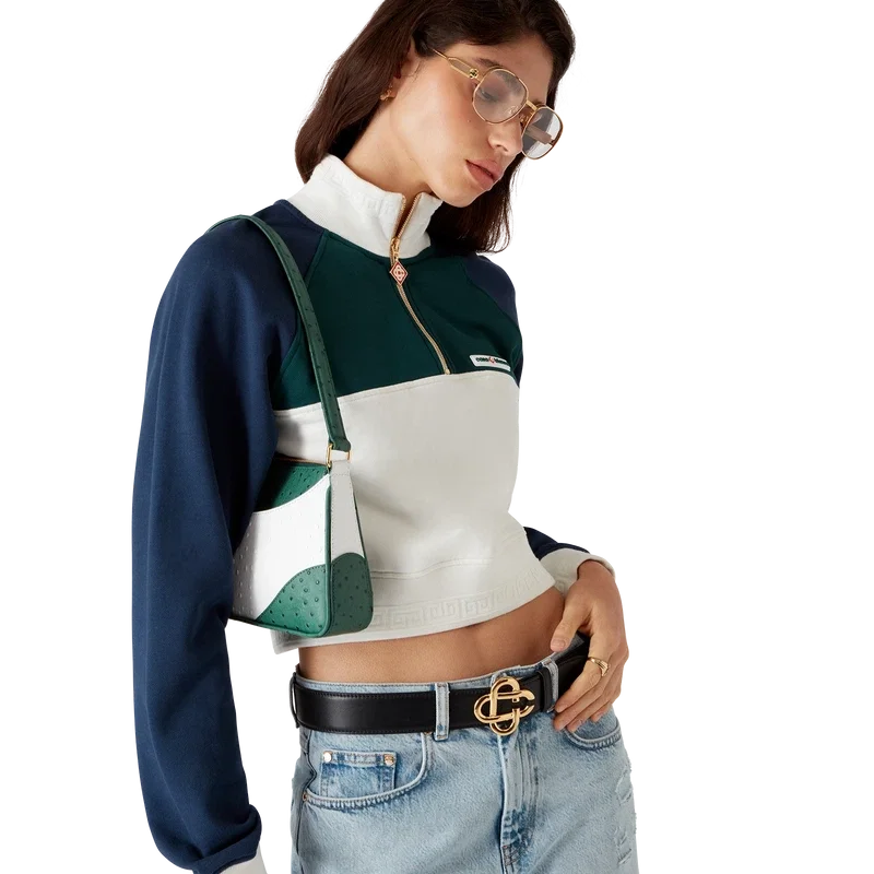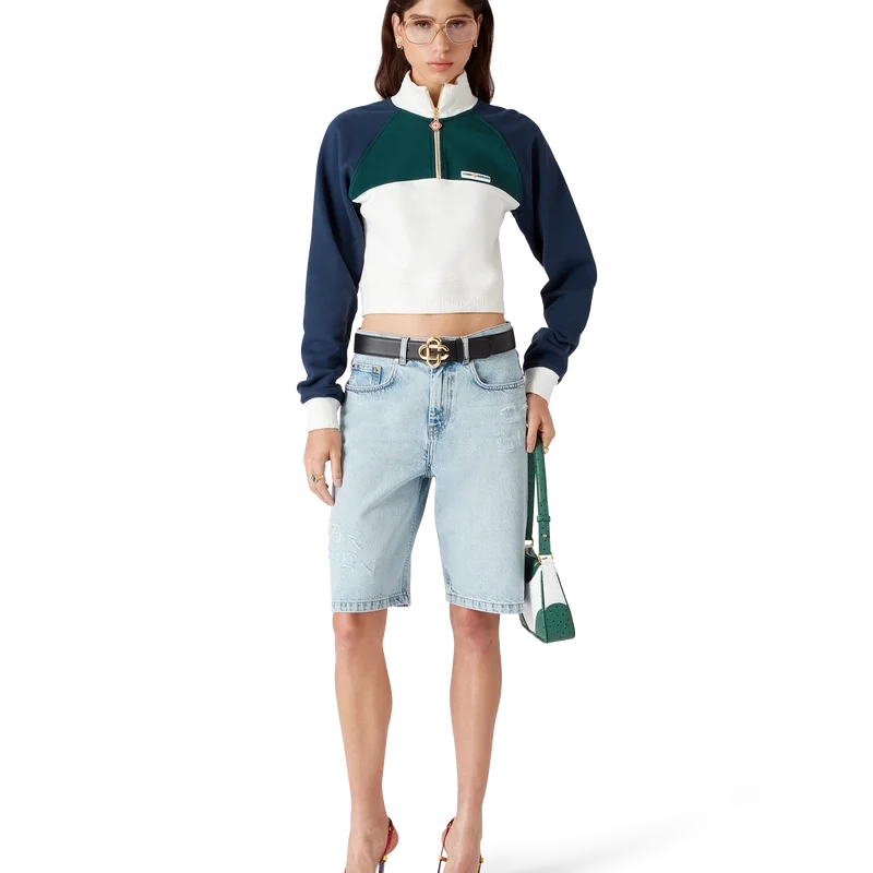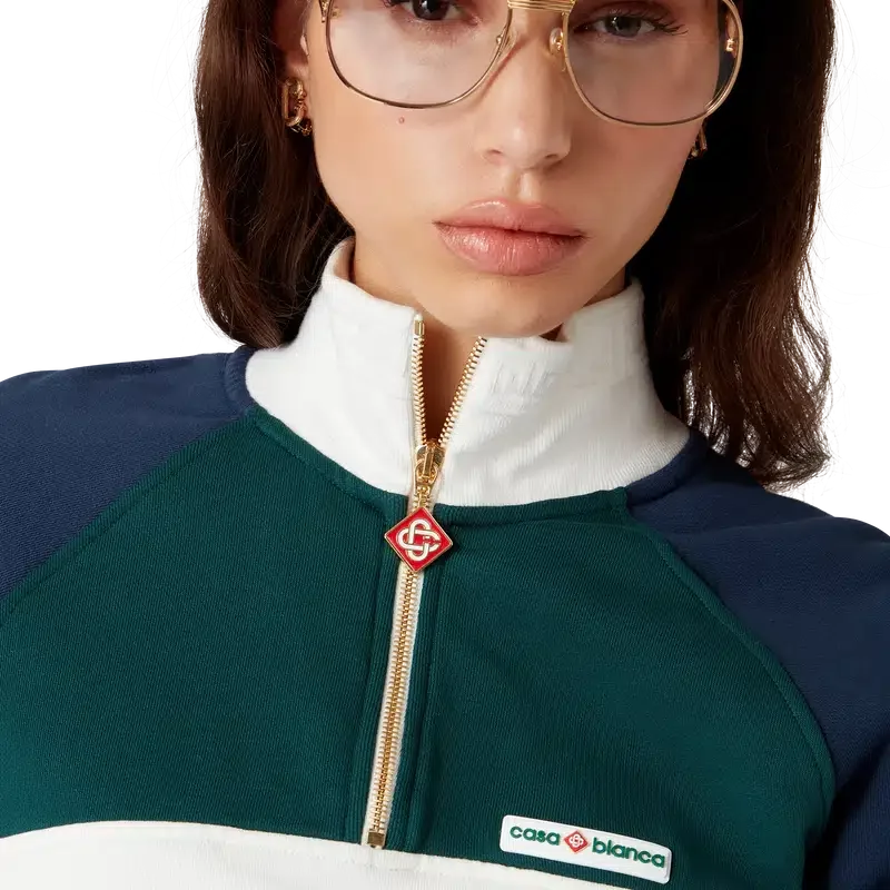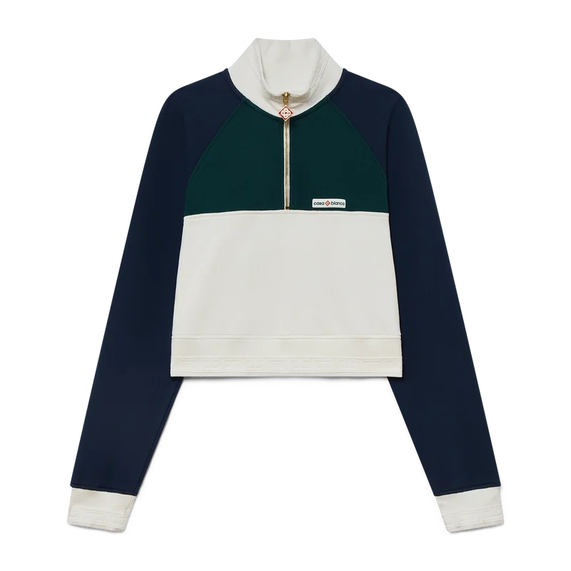 Das Colourblock Quarter Zip Cropped Sweatshirt ist ein langärmeliges Sportbekleidungsmodell aus Bio-Baumwollstoff. Mit dem Casablanca-Logo des Hauses, Colourblock-Einsätzen, geripptem Kragen, Bündchen und Saum mit Streifendetails.