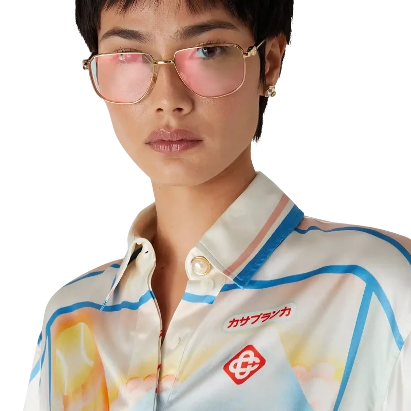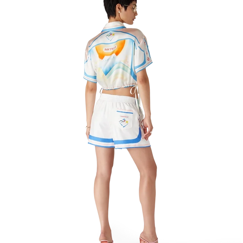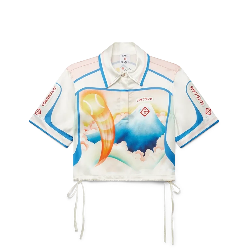 Das Fuji Dream Satin-Cropped-Shirt ist ein kurzärmeliges, bedrucktes Modell mit einem Motiv, das eine traumhafte Vision einer Reise zum Fuji zeigt – gefertigt aus Satin. Mit Spitzkragen, Knopfleiste, Corozo-Knöpfen mit Interlocking-CC-Logo und Kordelverschlüssen an den Seiten.