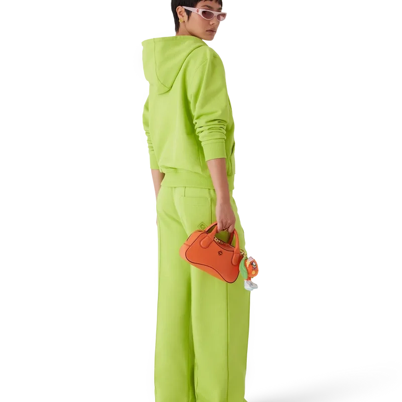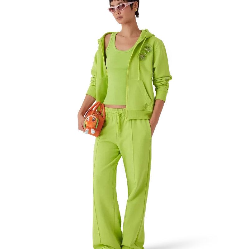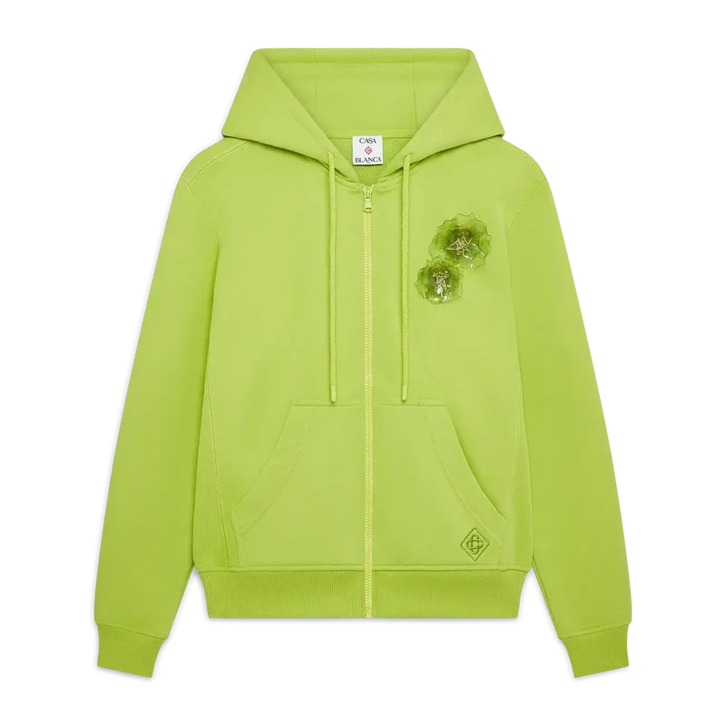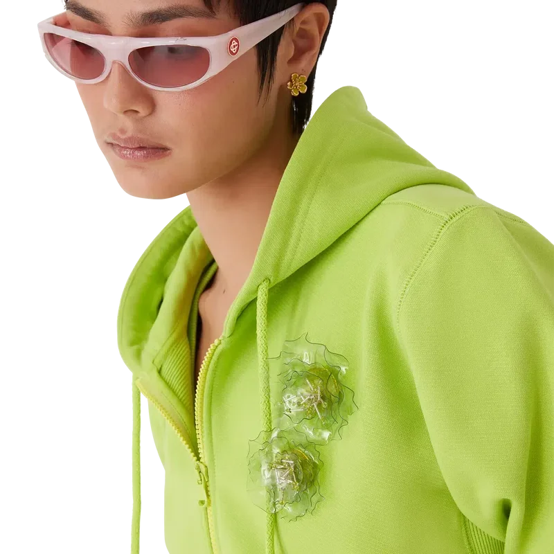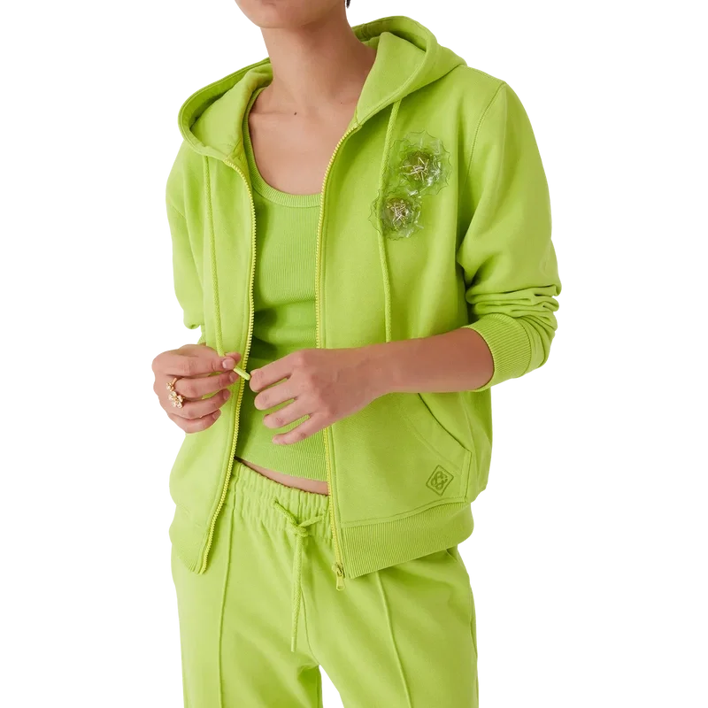Der Zip-Hoodie ist ein langärmeliges Sportdesign in Limettengrün mit zwei abnehmbaren Blumenbroschen. Abgerundet durch eine Kapuze mit Kordelzug, einen Reißverschluss, aufgesetzte Taschen vorne, gerippte Bündchen und einen gerippten Saum.