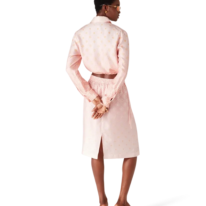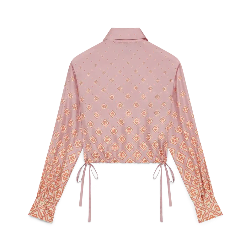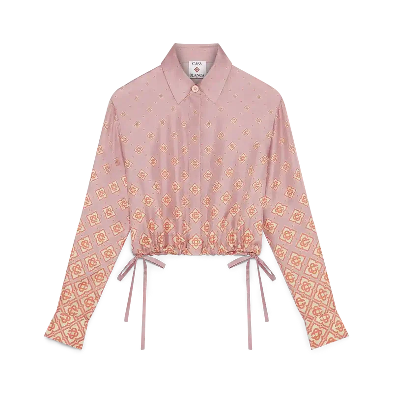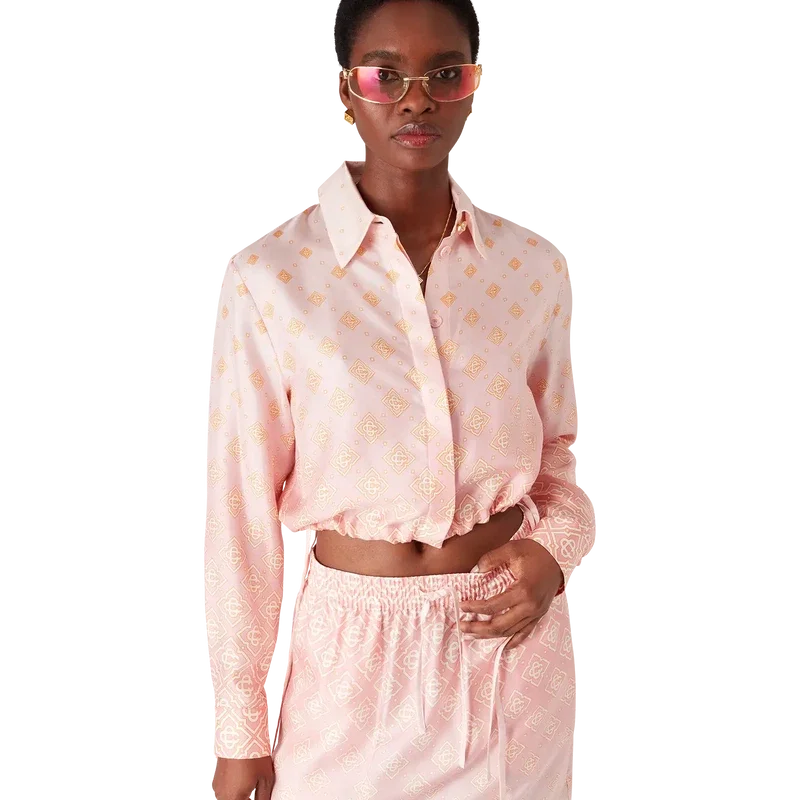 Das langärmelige Seidenhemd mit Monogram-Dégradé-Muster ist ein kurz geschnittenes Modell aus Seidentwill, das mit dem Monogram des Hauses in Farbverläufen verziert ist. Abgerundet durch einen spitzen Kragen, Knopfverschluss, Corozo-Knöpfe mit ineinander verschlungenem CC-Logo, charakteristische goldgeränderte Perlenknöpfe an Manschetten und Kragen, Kordelverschlüsse an den Seiten und eine verkürzte Silhouette.