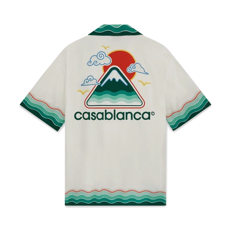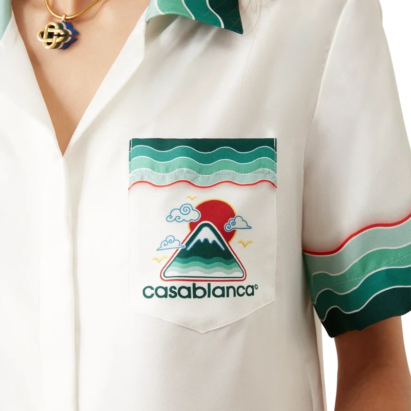 Das Montagne Ondulee Seidenhemd mit kurzen Ärmeln ist ein durchgehend bedrucktes Design mit dem saisonalen Kunstwerk des Hauses – inspiriert von Japans reichhaltiger Ikonografie für diese Kollektion, mit einem schlichten Layout und Kunstwerk, das mit nur wenigen Linien und Farben eine starke visuelle Botschaft vermittelt und es zu einem der Wahrzeichen der Kollektion macht – gefertigt aus Seidentwill. Abgerundet durch einen Kubanerkragen, verdeckte Knopfleiste, Corozo-Knöpfe mit ineinander verschlungenem Cc-Logo sowie von der Memphis-Welle inspirierte Streifenverzierungen an Kragen, Manschetten und Saum.
