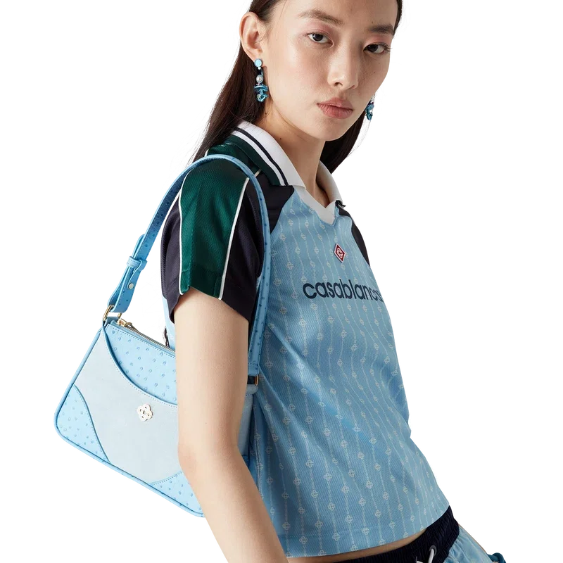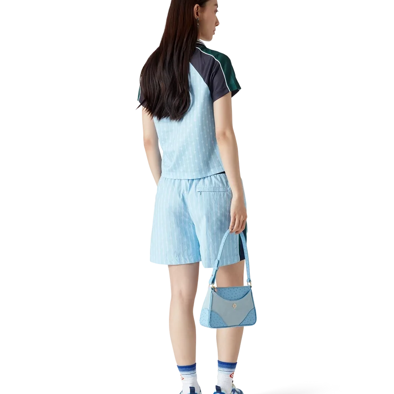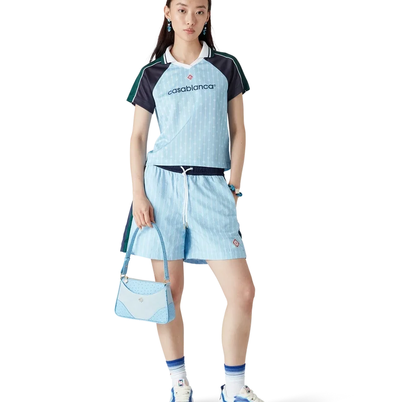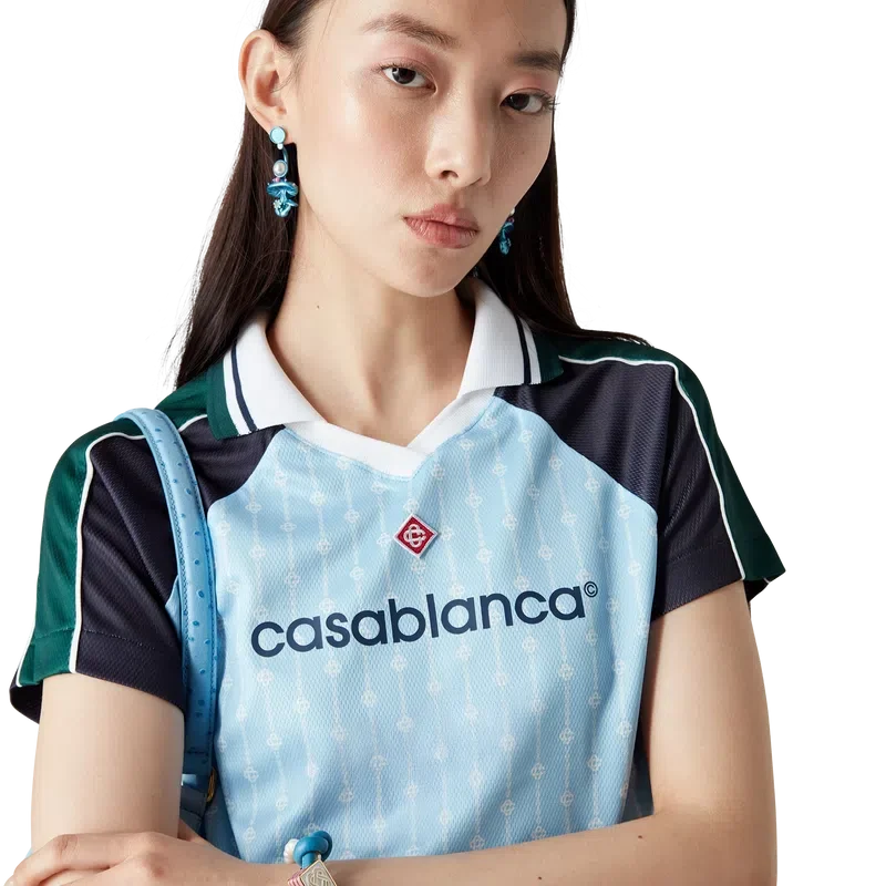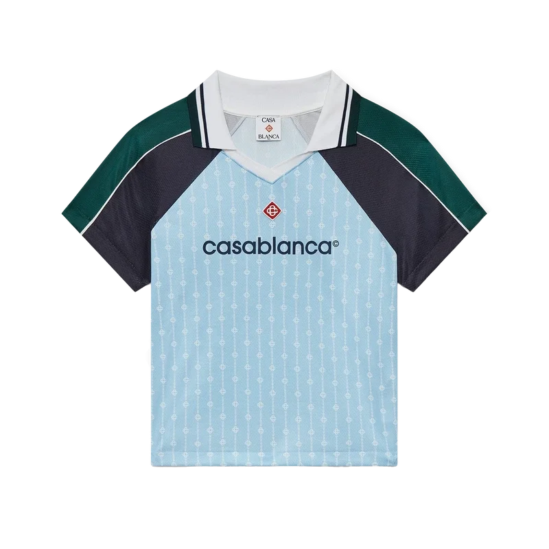 Das Pinstripe Laurel Fußballhemd ist ein kurzärmeliges Sportbekleidungsmodell aus Birdseye-Mesh-Gewebe mit dem charakteristischen, ineinander verschlungenen „Cc“-Logo des Hauses. Abgerundet wird es durch schwarze und grüne Einsätze an Schultern und Ärmeln, ein charakteristisches Rautenlogo, das Casablanca-Logo, weiße Paspeln sowie einen gerippten V-Ausschnitt und Kragen mit schwarz-weiß-grün gestreiften Kanten.