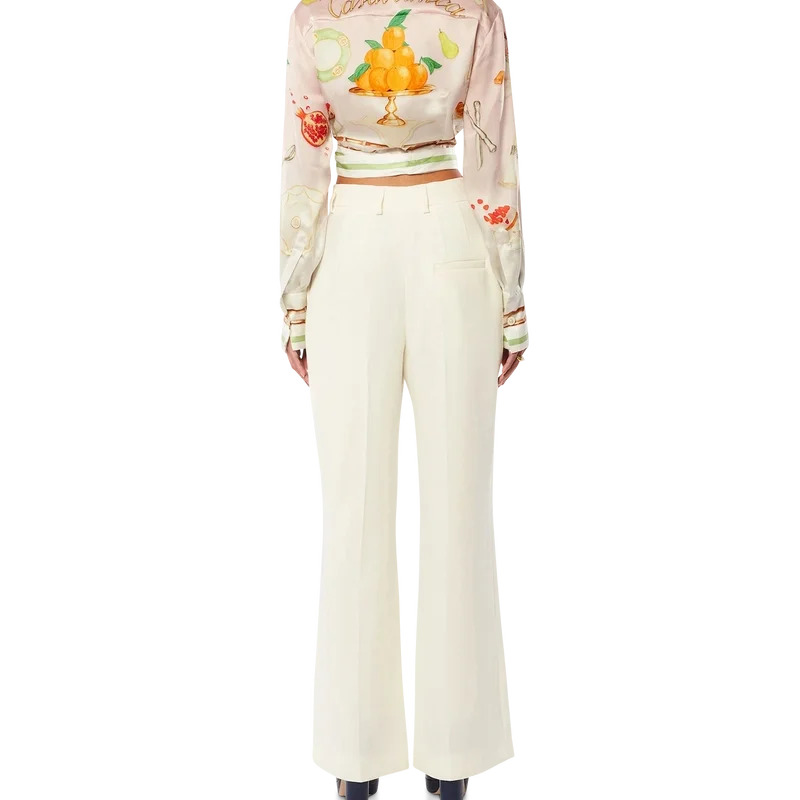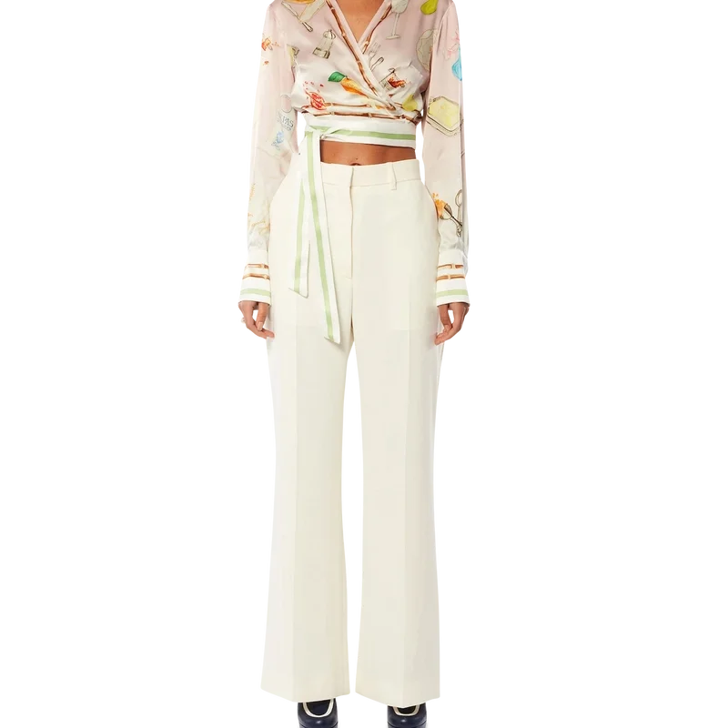 Die „Ne Pas Deranger“ Wickelbluse ist ein langärmeliges Modell mit V-Ausschnitt und einem Allover-Print, der die klassische ikonografische orangefarbene Pyramide des Hauses zeigt. Das aus Seidentwill gefertigte Kleidungsstück verfügt über einen Wickelverschluss mit Schleife, Streifendetails an Kragen, Manschetten, Saum und Schleife sowie ein Casablanca-Markenlabel.