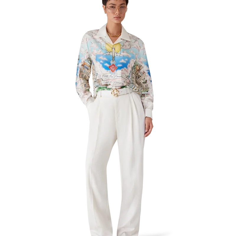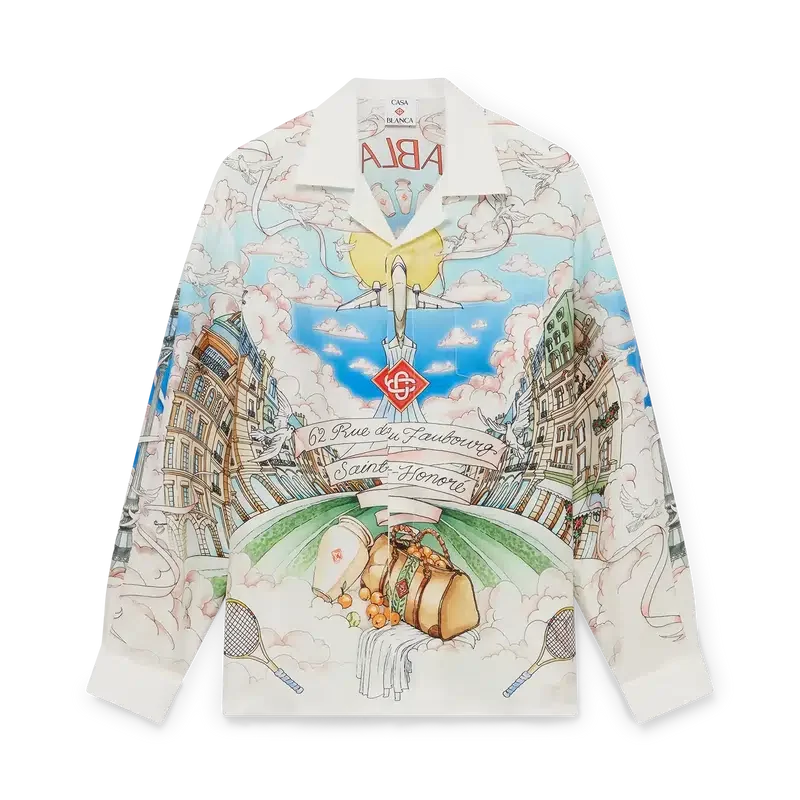 Das langärmelige Seidenhemd von La Vie Parisienne ist ein Modell mit Allover-Print, das exklusiv für unseren Flagship-Store entworfen wurde. Es zeigt ein Design, das von Architektur, Tennis, Natur und Reisen inspiriert ist und unseren Pariser Store in der Rue du Faubourg Saint-Honoré darstellt – einer der weltweit geschichtsträchtigsten Straßen für Mode und Design und ein Symbol für französische Eleganz und Raffinesse. Abgerundet wird das Design durch einen Kubanerkragen, einen Knopfverschluss, Corozo-Knöpfe mit dem ineinander verschlungenen Cc-Logo sowie emaillierte Knöpfe mit Goldrand an den Manschetten. Dieses Modell ist exklusiv auf Casablancaparis.Com und in unserem Pariser Store erhältlich.