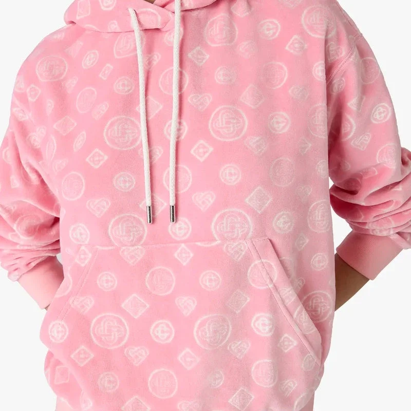 Das rosa Velours-Sweatshirt mit Kapuze und Monogramm ist ein langärmeliges Modell mit dem charakteristischen Icon-Monogramm-Muster des Hauses in einer rosa-weißen Farbgebung. Abgerundet wird es durch eine Kapuze mit Kordelzug, eine Kängurutasche, gerippte Säume und Bündchen sowie eine lockere Sportswear-Silhouette.