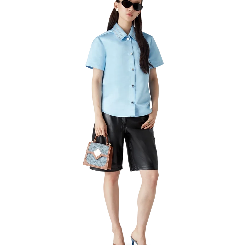 Das kurzärmelige Satin-Shirt ist ein klassisches Design aus Satin. Mit Knopfleiste, vergoldeten Markenknöpfen, einem spitzen Kragen, einem abgerundeten Saum, einer Brusttasche und Perlenverzierungen an Kragen und Brusttasche.