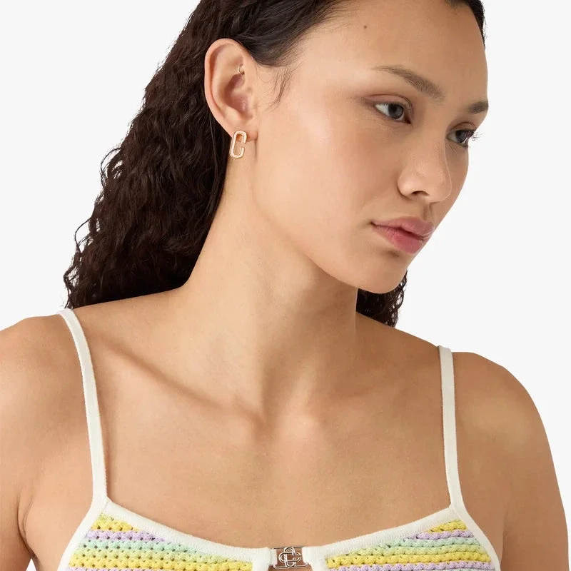 Das gestreifte Minikleid „Bourgeois“ ist ein raffiniertes Strickdesign mit eleganten horizontalen Streifen. Abgerundet wird es durch kontrastierende Spaghettiträger, das versilberte Warped-Logo des Hauses auf der Brust und einen Ausschnitt in Schlüssellochform – eine schmeichelhafte Silhouette, die den gehobenen Ansatz des Hauses in Sachen Strickwaren verkörpert.