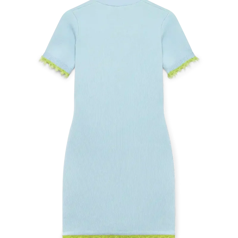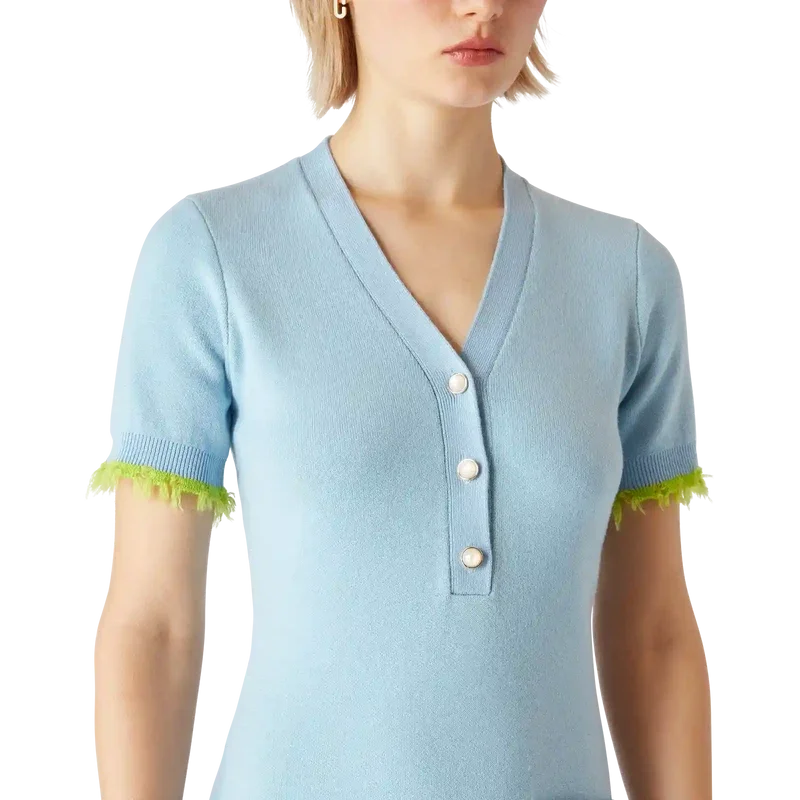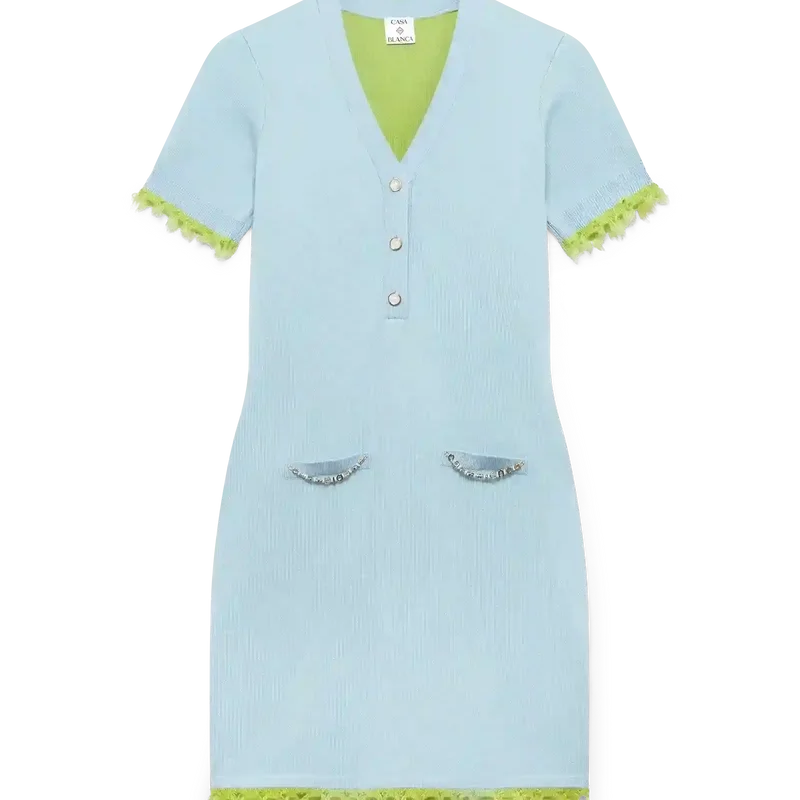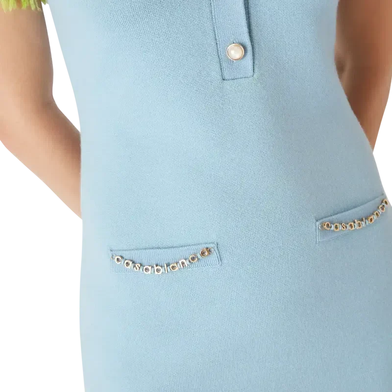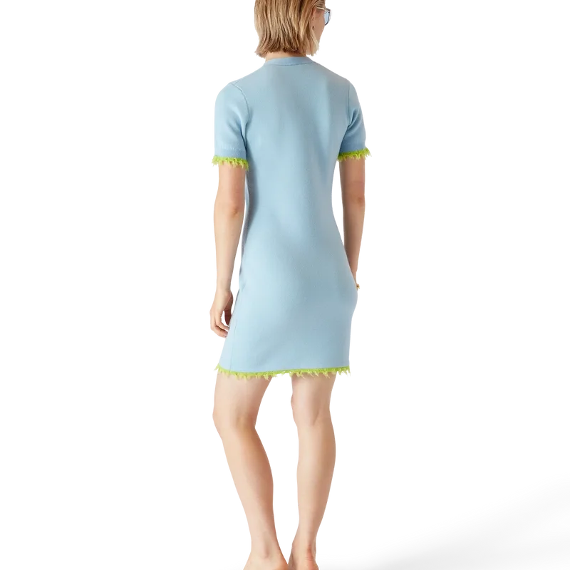 Das Merino-Minikleid ist ein kurzärmeliges Minikleid aus Wollstoff mit klassischer Silhouette. Es verfügt über einen tiefen V-Ausschnitt, einen Knopfverschluss, Paspeltaschen, charakteristische goldgerahmte Perlenknöpfe, gerippte Bündchen und einen Saum mit ausgefransten Kanten sowie eine lockere Passform.