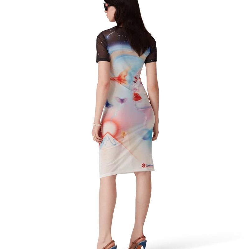Das Galactic Connection Mesh-Kleid mit kurzen Shorts ist ein bedrucktes Design aus Mesh-Stoff mit dem saisonalen Airbrush-Motiv des Hauses – inspiriert von Pater Sato; mit Galactic Connection erkunden wir, wer die bionischen Wesen von Casablanca sein könnten, während wir die Bergelemente im Hintergrund beibehalten. Abgerundet durch einen klassischen Rundhalsausschnitt.