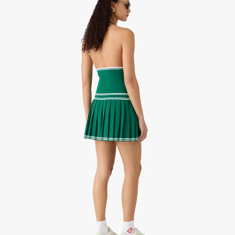 Das grüne, plissierte Neckholder-Minikleid besticht durch ein raffiniertes Design mit einem taillierten Oberteil aus Strickstoff, das mit dem charakteristischen Rautenlogo des Hauses verziert ist. Abgerundet wird es durch einen Neckholder-Ausschnitt, weiße Streifendetails an Oberteil und Saum, einen tiefen V-Ausschnitt, einen Bindeverschluss und einen plissierten Rockteil für eine feminine Silhouette.<!–