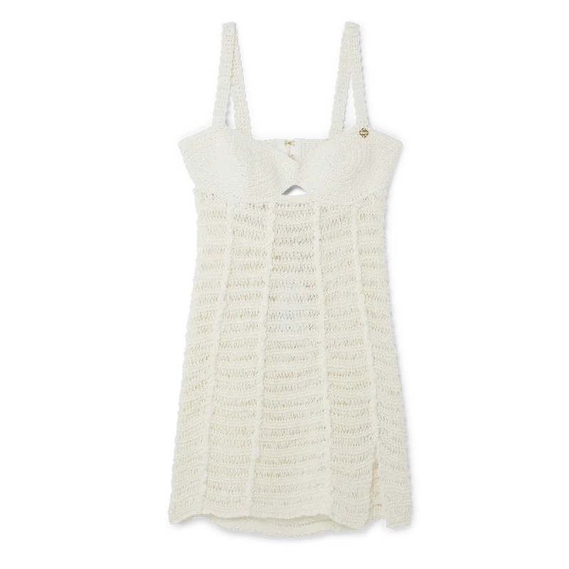 Das gehäkelte Bustier-Kleid ist ein Minikleid aus einem offen gewebten Baumwollmischgewebe mit einem eng anliegenden Bralette-Oberteil und einem tiefen Rückenausschnitt. Abgerundet wird es durch einen Haken-und-Ösen-Verschluss, eine vergoldete Cc-Niete und Schulterträger.