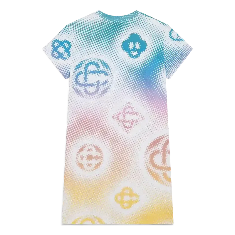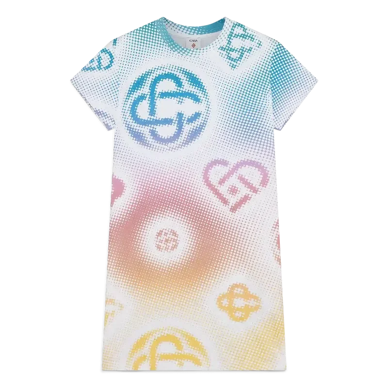 Das Halftone-T-Shirt-Kleid ist ein kurzärmeliges Modell aus bedrucktem Baumwollstoff mit einem Monogramm-Motiv des Hauses, das im Airbrush-Verfahren aufgebracht wurde und auf unseren früheren Experimenten mit dieser Technik aufbaut. Es verfügt über einen klassischen Rundhalsausschnitt und eine lockere Silhouette.