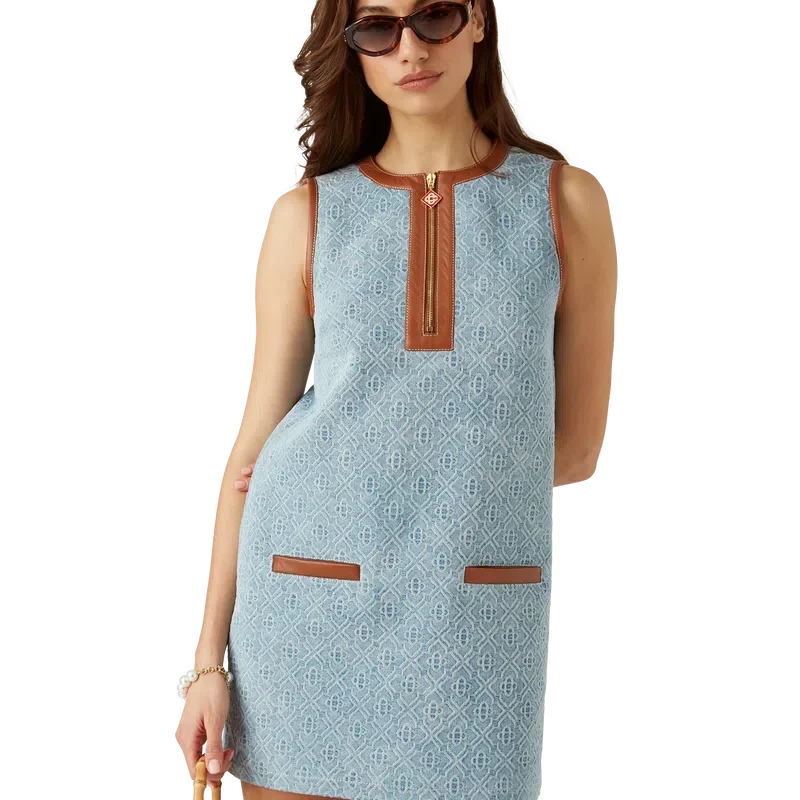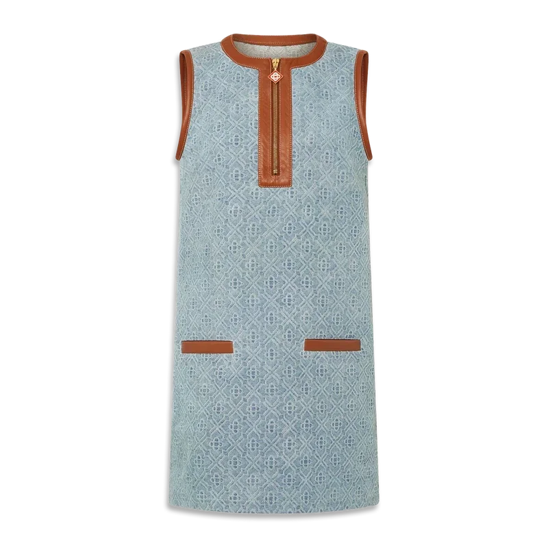 Das Monogram-Jeans-Kleid ist ein ärmelloses Minikleid im Shift-Stil aus einem Denimstoff aus Baumwollmischung. Mit Viertelreißverschluss vorne mit charakteristischer Monogram-Reißverschlusslasche, aufgesetzten Taschen vorne, Rundhalsausschnitt, Armausschnitten, Kragen, Taschen und Knopfleiste, alles mit Nappaleder eingefasst – für eine klassische Passform entworfen.