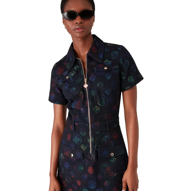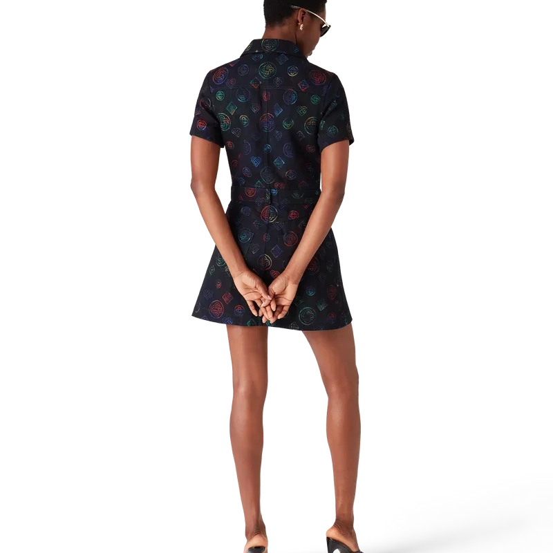 Das Heatmap Monogram Denim Kleid ist ein kurzärmeliges A-Linien-Minikleid aus Baumwoll-Denim mit dem charakteristischen Heatmap-Motiv der Saison. Es verfügt über einen Frontreißverschluss mit dem markentypischen Reißverschlussschieber mit Diamond Monogram, Gürtelschlaufen, Pattentaschen und vergoldeten Metallbeschlägen mit Markenlogo.