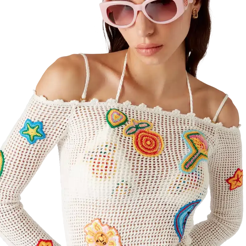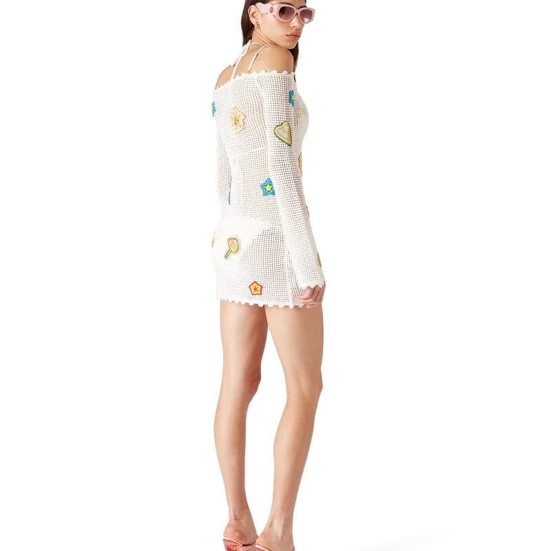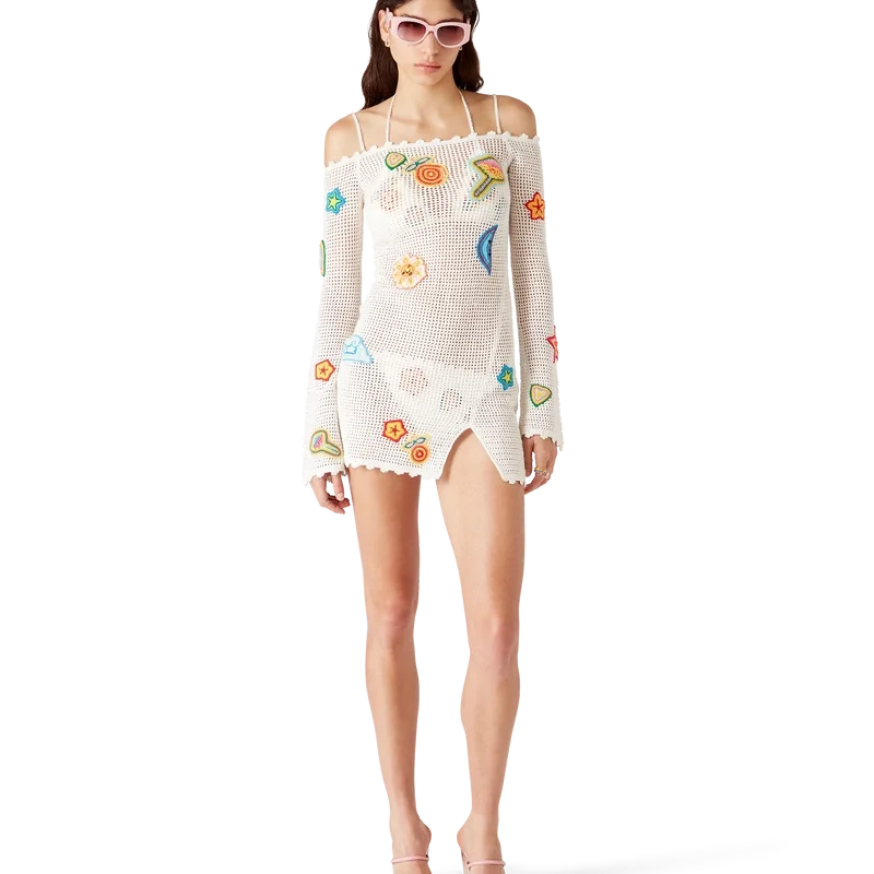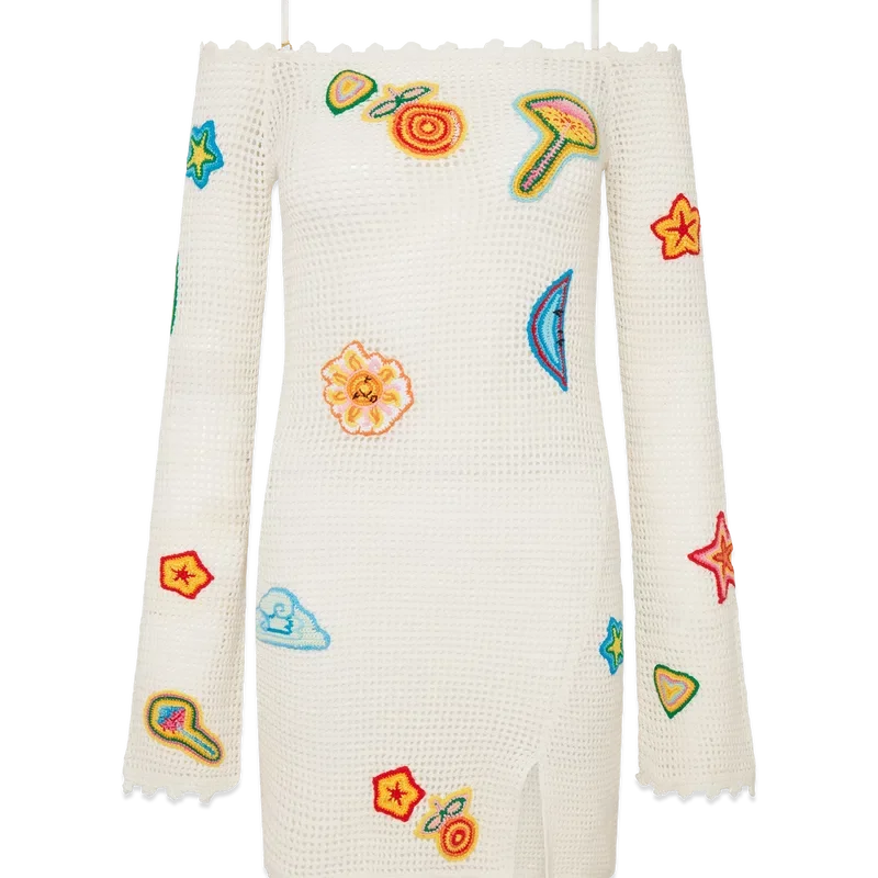 Das Motif Crochet Kleid ist ein langärmeliges, gestricktes Minikleid aus Häkelstoff, das die charakteristischen Designelemente des Hauses aufweist. Abgerundet durch Glockenärmel mit Schlitzdetail, einen U-Boot-Ausschnitt und einen Saum mit Schlitz.