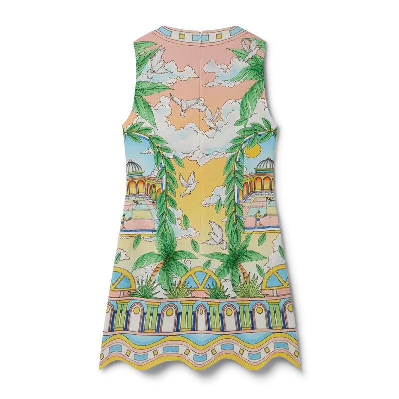 Das Paysage Ideal Cocktailkleid ist ein ärmelloses Minikleid mit A-Linien-Silhouette, das mit saisonalen Motiven in einem traditionellen Layout verziert ist. Im Mittelpunkt stehen Bögen, Symmetrie und das ideale Universum von Casablanca, untermalt von einer hellen und idealistischen Farbpalette, die die für unsere Marke zentralen ätherischen Themen unterstreicht.
