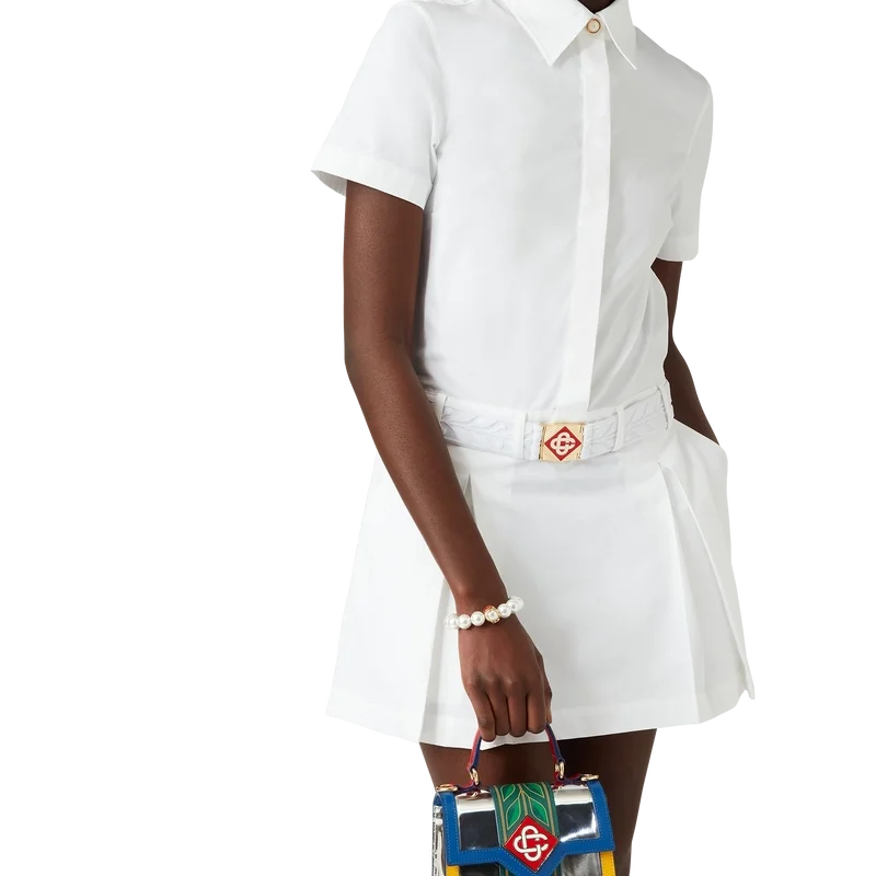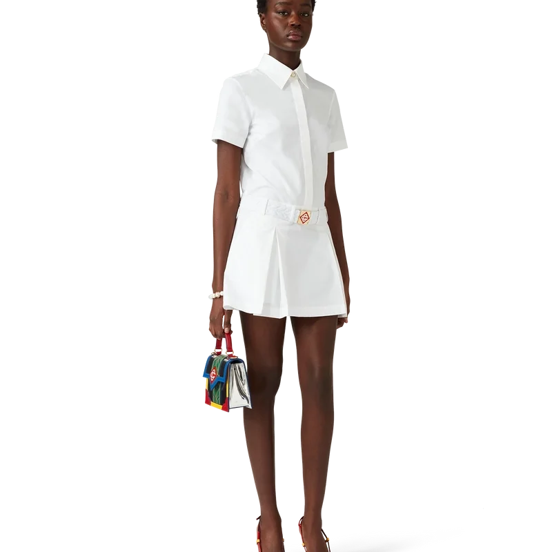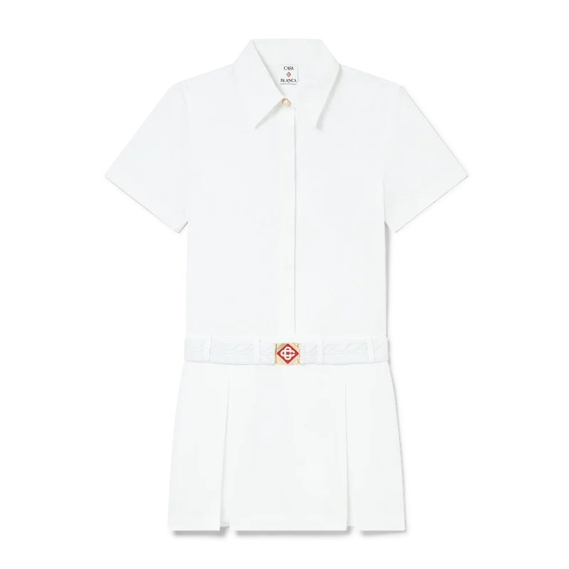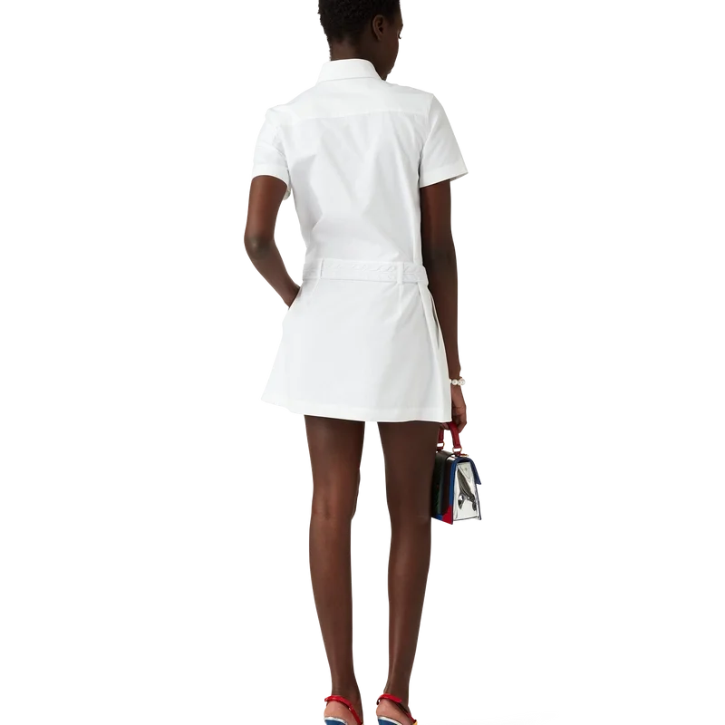 Das plissierte Tennis-Minikleid ist ein kurzärmeliges Minikleid mit A-Linien-Silhouette aus Baumwolltwill. Mit Knopfleiste vorne, offenem Kragen, Brusttasche, Bund und einem plissierten Rockteil mit umgekehrten Falten.