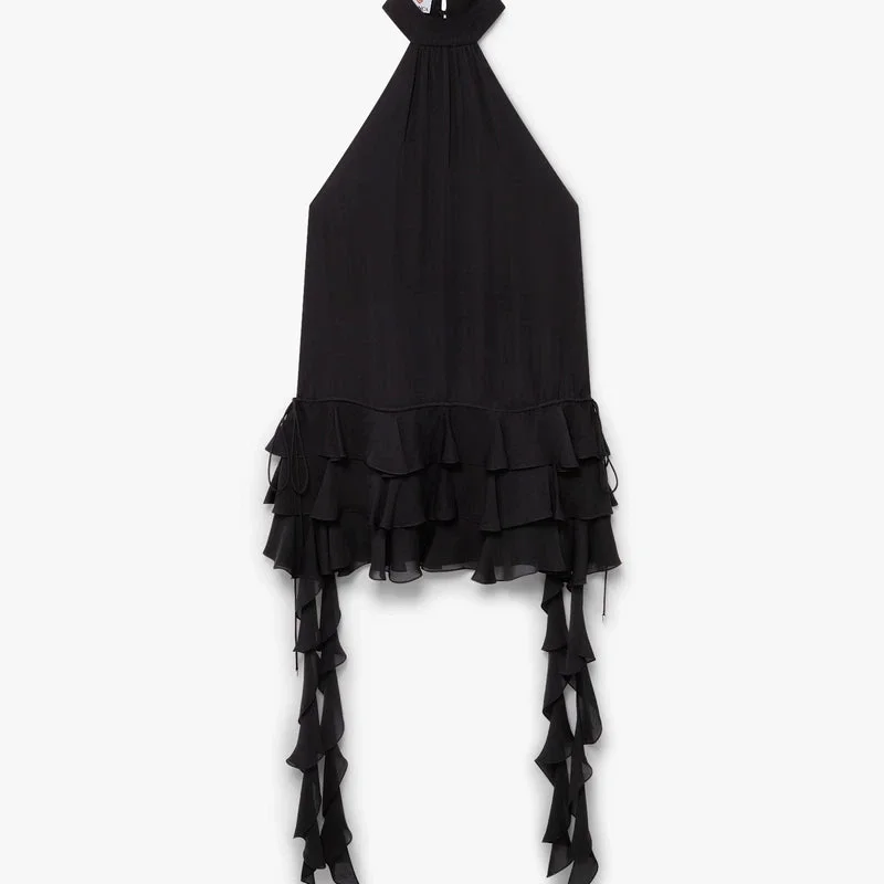 Das schwarze Georgette-Minikleid mit doppelten Rüschen ist ein raffiniertes Design aus luxuriösem schwarzem Georgette-Stoff. Es verfügt über einen Neckholder-Ausschnitt, das versilberte Warped-Logo des Hauses auf der Brust, einen tiefen Rückenausschnitt und elegante Rüschenverzierungen für eine feminine Silhouette.