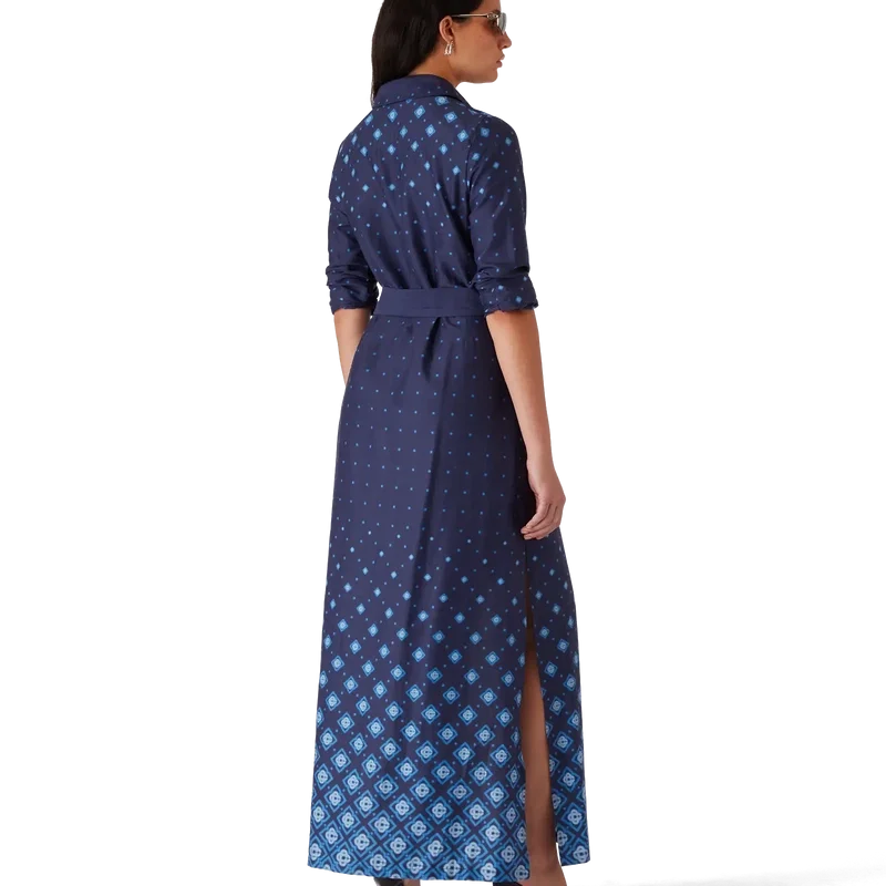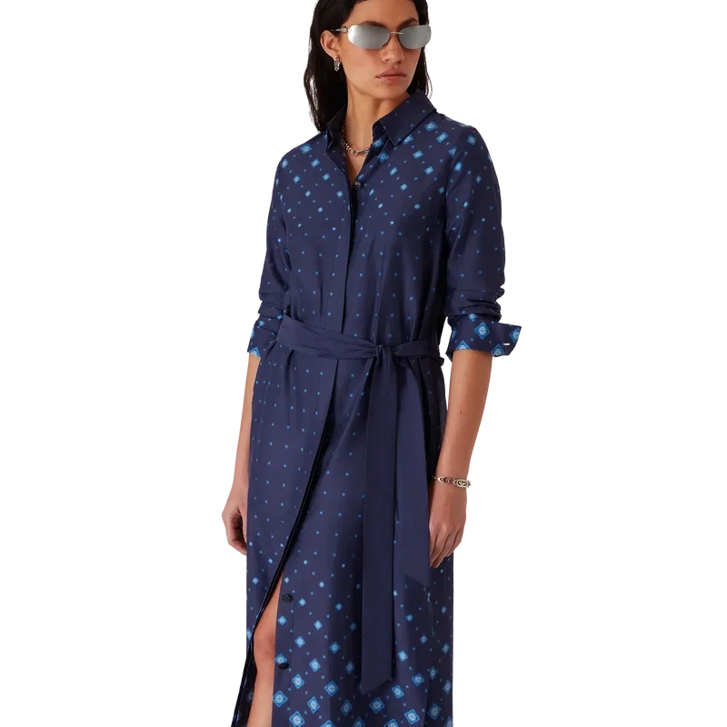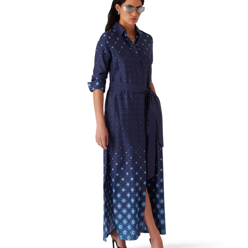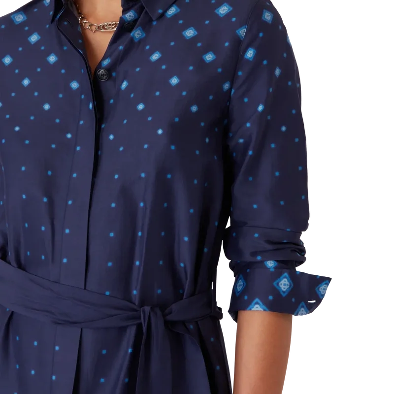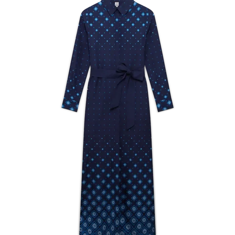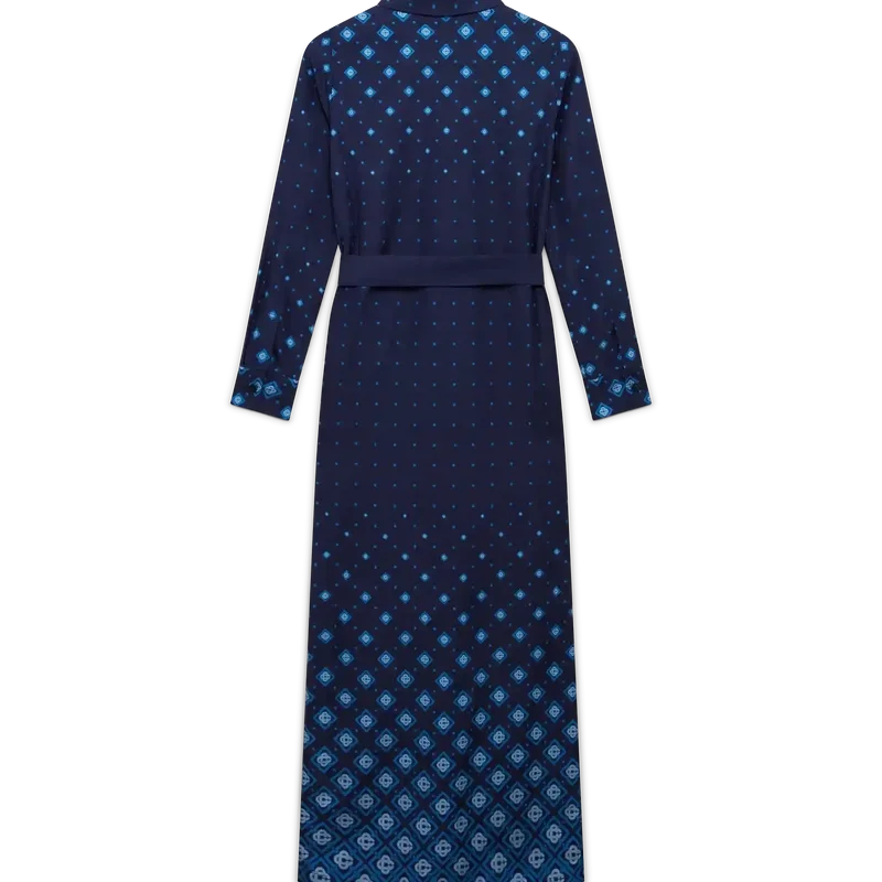 Das Seidenhemdkleid ist ein klassisches, langärmeliges, bodenlanges Design mit dem charakteristischen Monogram-Farbverlaufsdruck des Hauses, bei dem sich tonale Farbverläufe über die gesamte Silhouette erstrecken. Abgerundet wird das Design durch einen spitzen Kragen, einen durchgehenden Knopfverschluss, Corozo-Knöpfe mit ineinander verschlungenem CC-Logo, Gürtelschlaufen, einen farblich abgestimmten Stoffgürtel sowie goldrandige Emaille-Knöpfe an Kragen und Manschetten.
