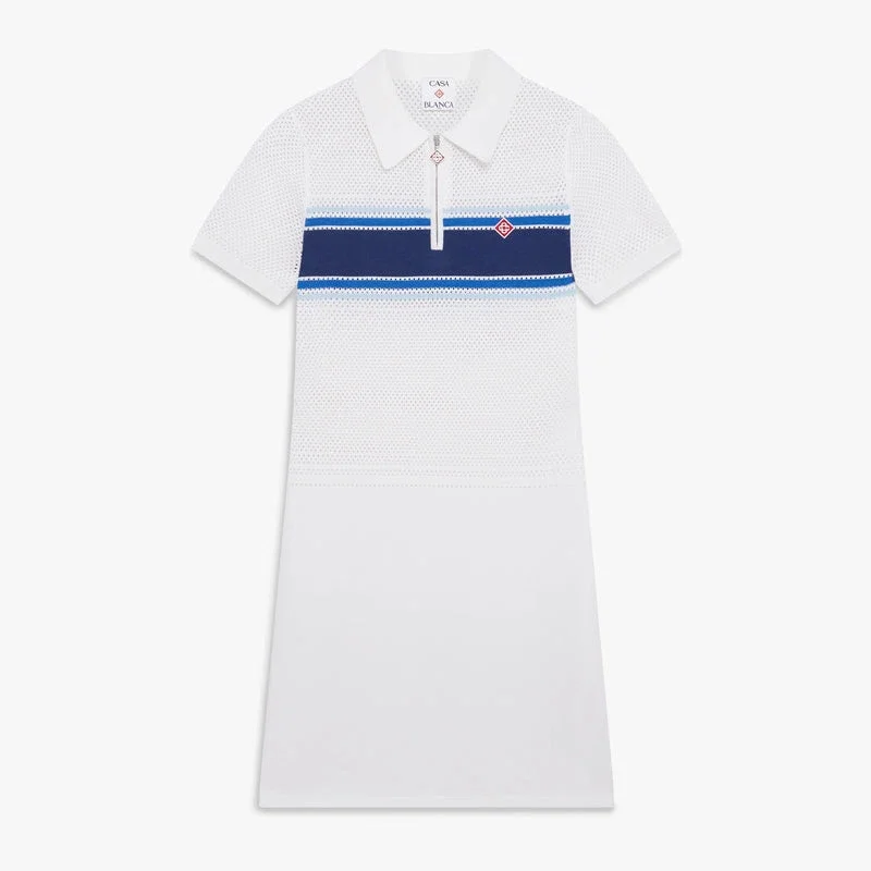 Das weiß-blau gestreifte Midi-Kleid aus Mesh ist ein raffiniertes Strickdesign mit einem blauen Streifen über Brust und Rücken sowie einer eleganten Jacquard-Struktur aus Mesh-Streifen. Abgerundet wird es durch einen klassischen Kragen, einen Reißverschluss, das charakteristische Rautenlogo des Hauses, kurze Ärmel mit gerippten Bündchen und eine lockere Midi-Silhouette.