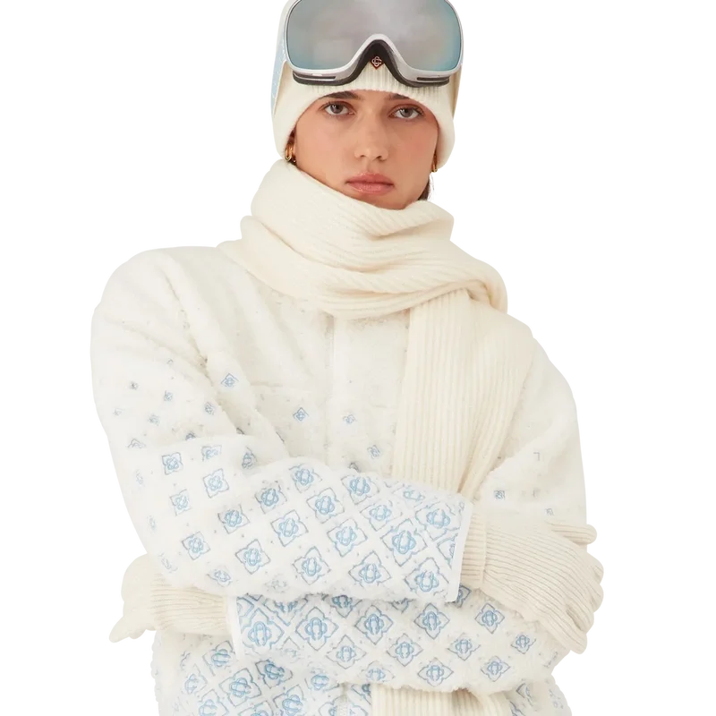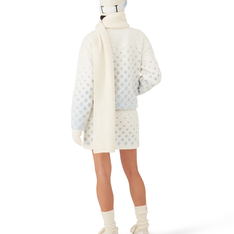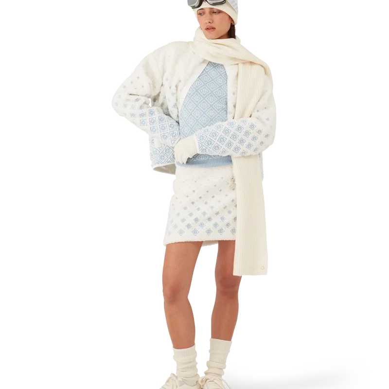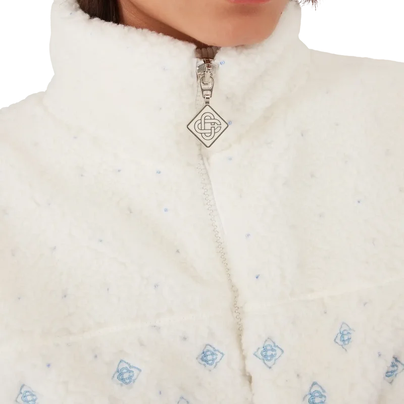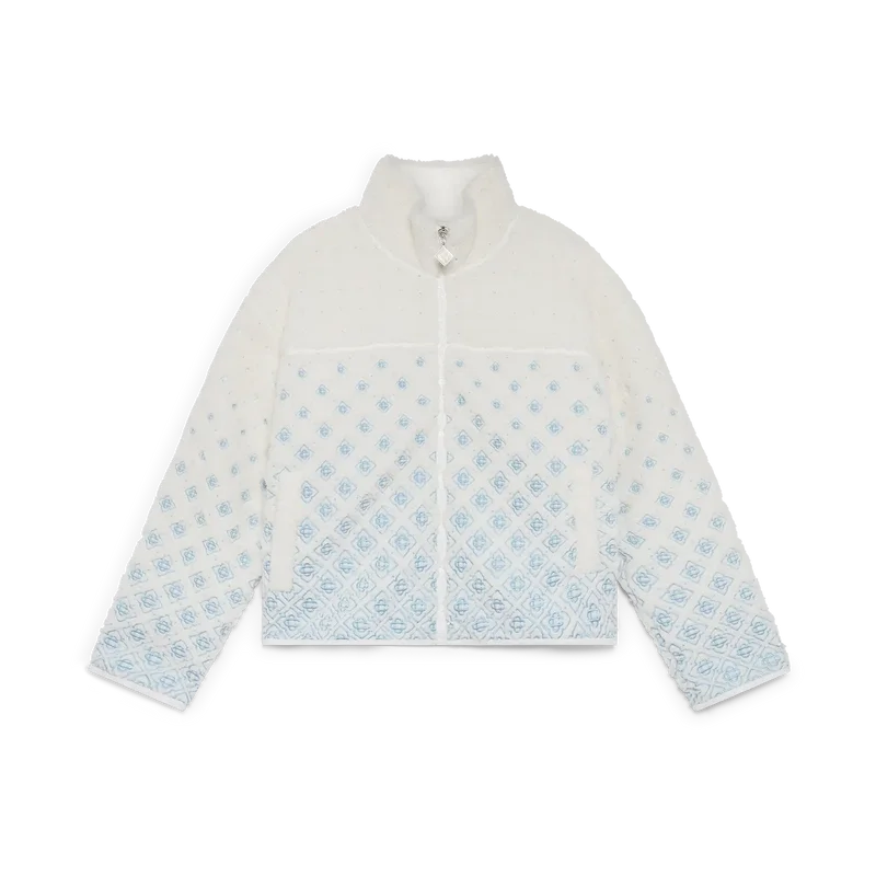 Die bestickte, verkürzte Fleecejacke mit Farbverlaufs-Monogramm ist ein raffiniertes Design der Oberbekleidung aus technischem Fleece-Stoff in Weiß, inspiriert von den flauschigen Texturen des legendären Pulverschnees Japans. Sie greift den einladenden Komfort des traditionellen Landlebens auf, wo dampfende heiße Quellen Erholung von der Winterkälte bieten und sanfter Schneefall die Welt in Stille hüllt.