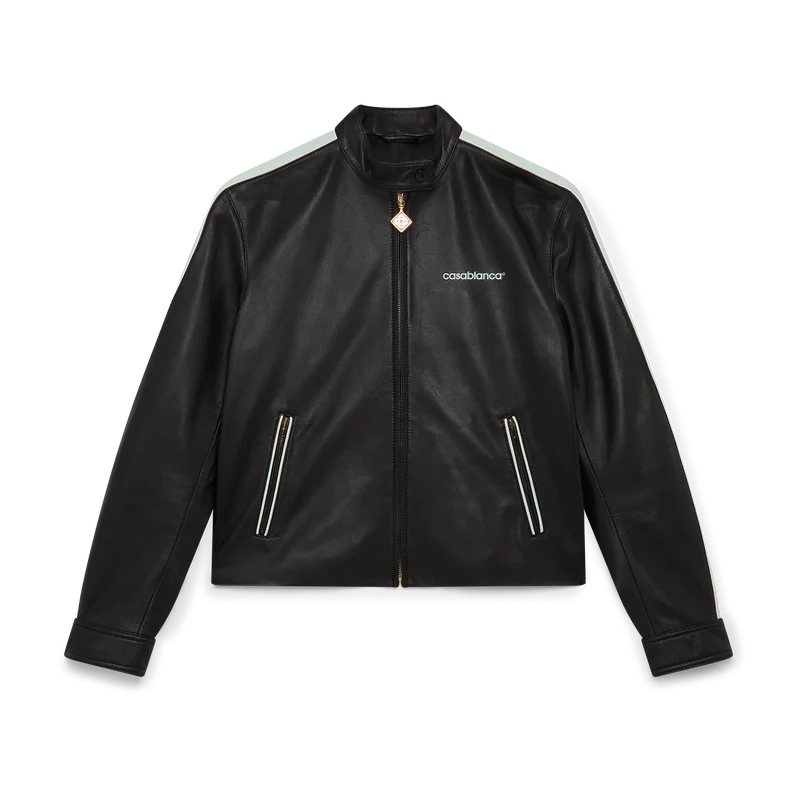Die Leder-Racerjacke ist ein Slim-Fit-Sportbekleidungsmodell aus Lamm-Nappa. Mit Reißverschluss, schrägen Vordertaschen mit Reißverschluss, Streifendetails an den Ärmeln und dem „Casablanca“-Logo des Hauses.