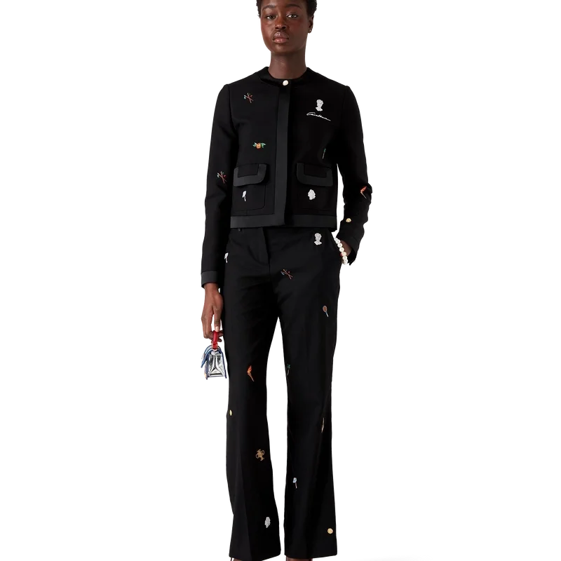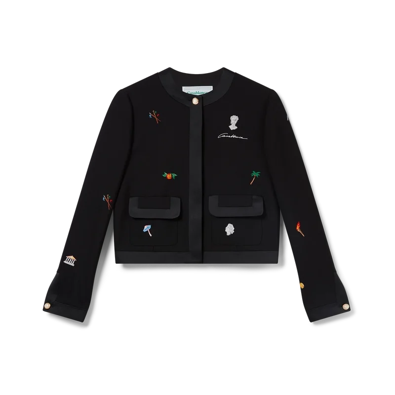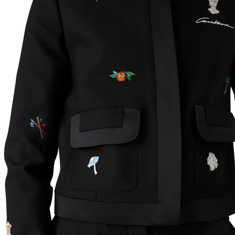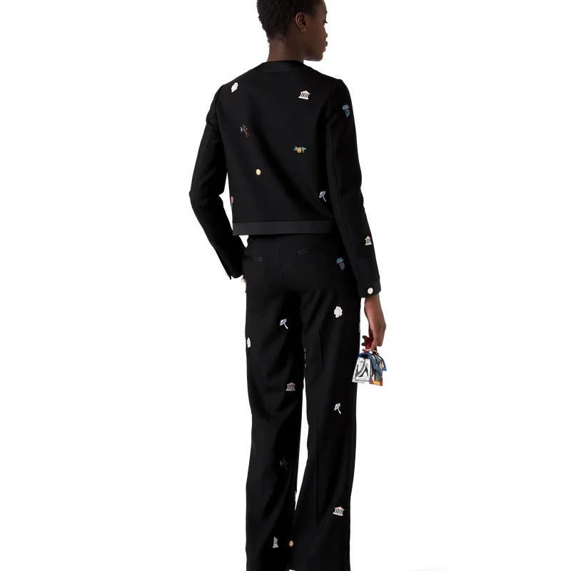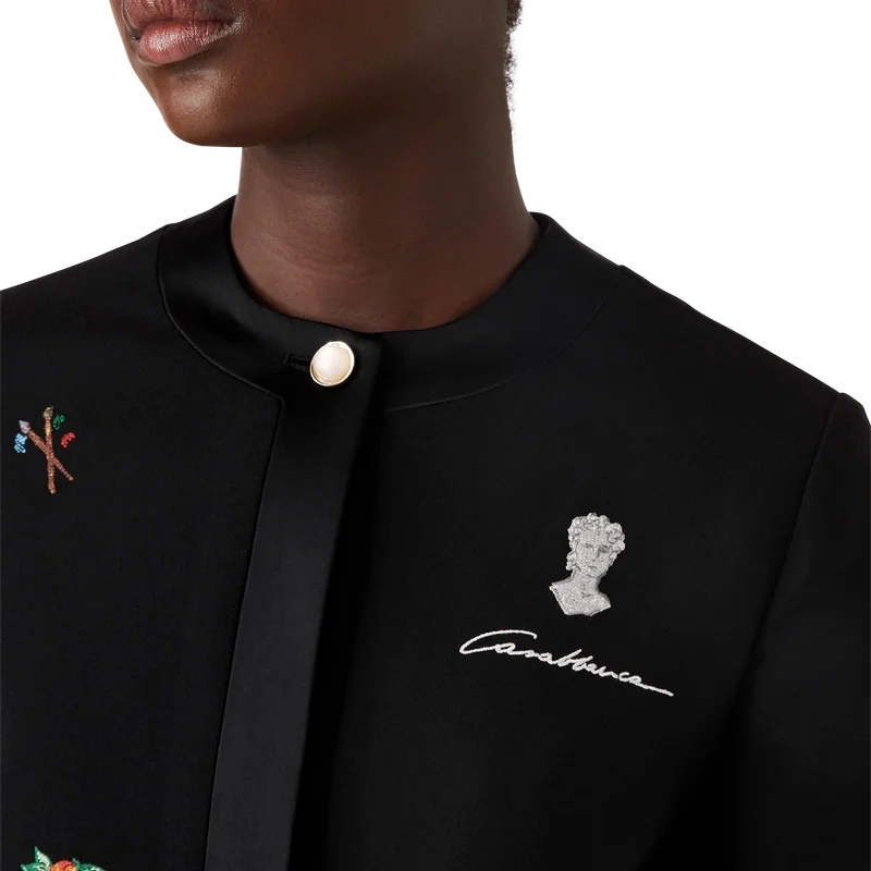 Die taillierte Wolljacke mit gesticktem Motiv ist ein kurz geschnittenes Modell aus besticktem Wollstoff. Mit Stickereien verziert, die die Symbolik des Hauses in Bezug auf Natur und Architektur darstellen, sowie mit Taschen, einem Futter, einem goldgerahmten Perlknopf am Kragen, Knopfverschluss und Kantenverzierungen an Kragen, Knopfleiste, Saum und Taschen. Geeignet zum Tragen mit der dazu passenden, maßgeschneiderten Hose.