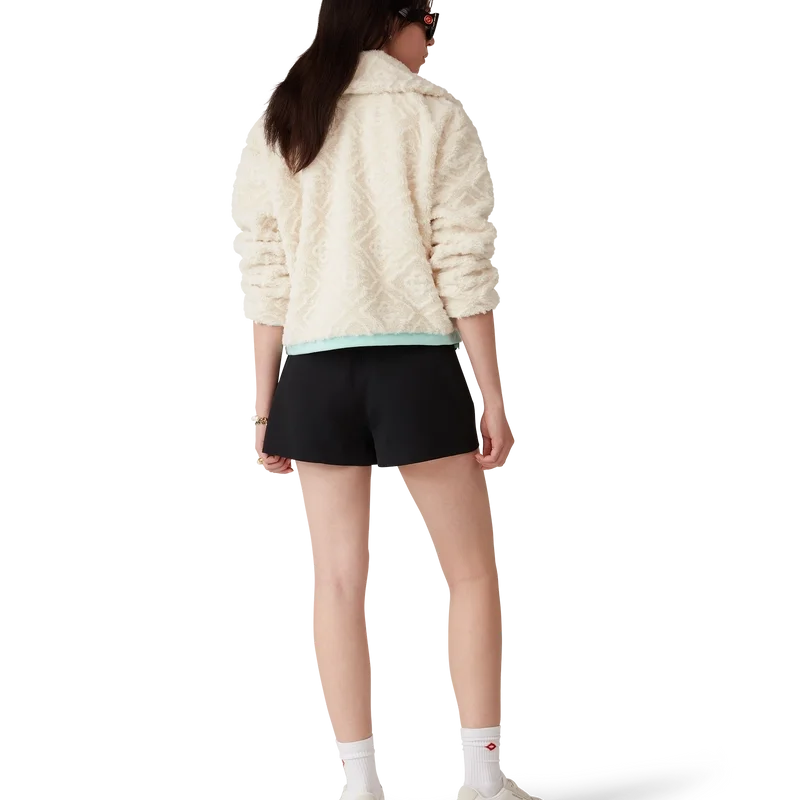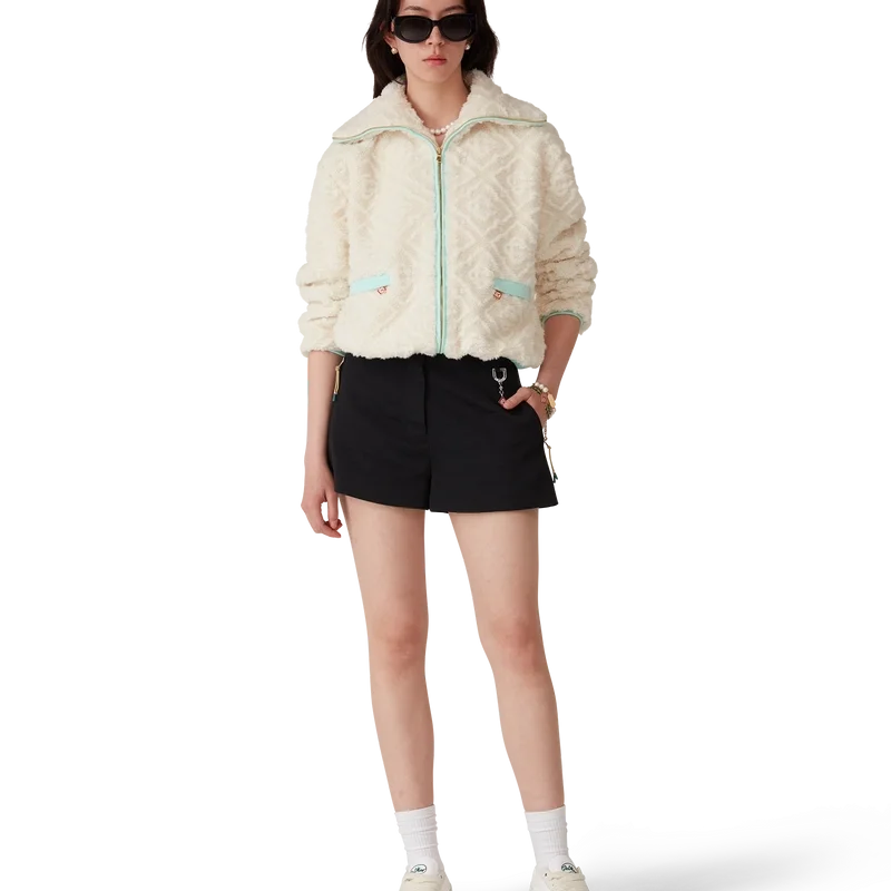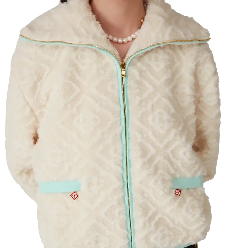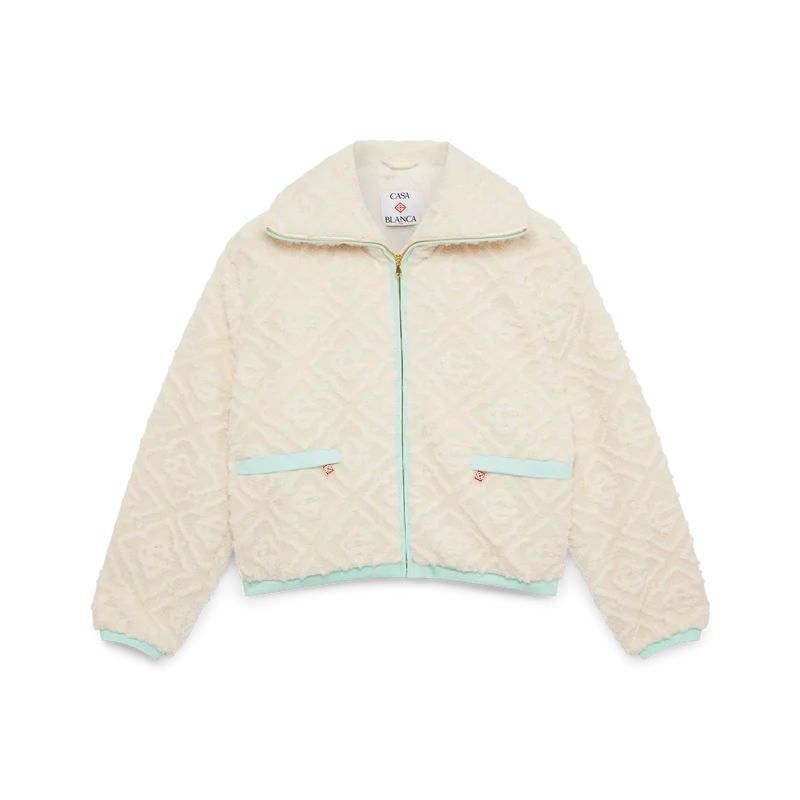 Die Monogram Jacquard Fleece-Jacke ist ein langärmeliges Modell mit weicher Textur aus Fleece-Stoff. Sie verfügt über einen Trichterkragen, einen Reißverschluss mit dem charakteristischen Diamant-Logo des Hauses am Reißverschlusszug, pastellfarbene gerippte Bündchen, Saum- und Kapuzenranddetails sowie Taschen mit Reißverschluss.