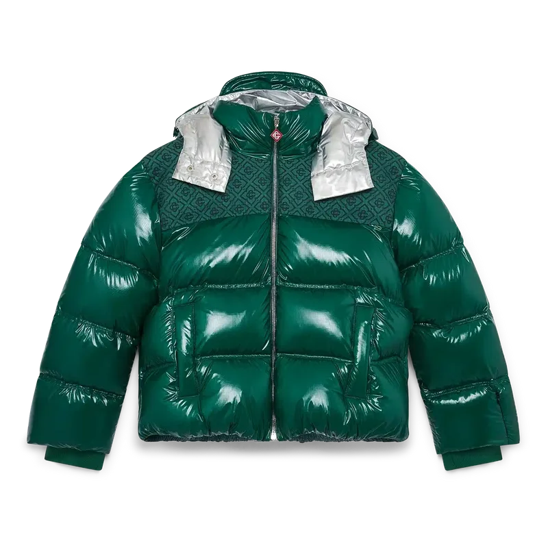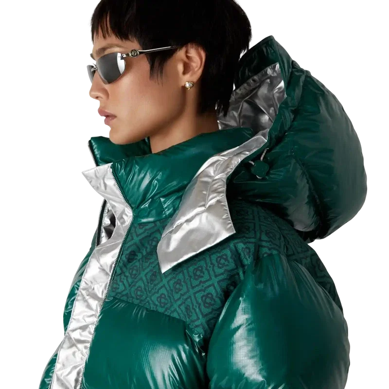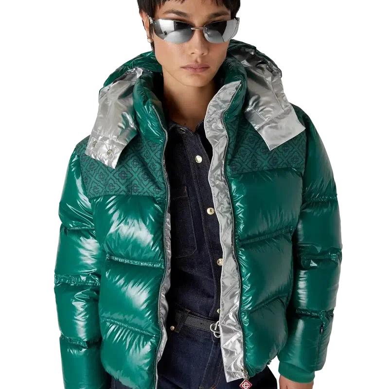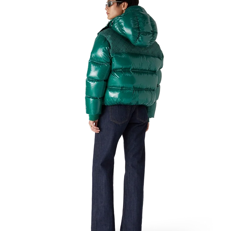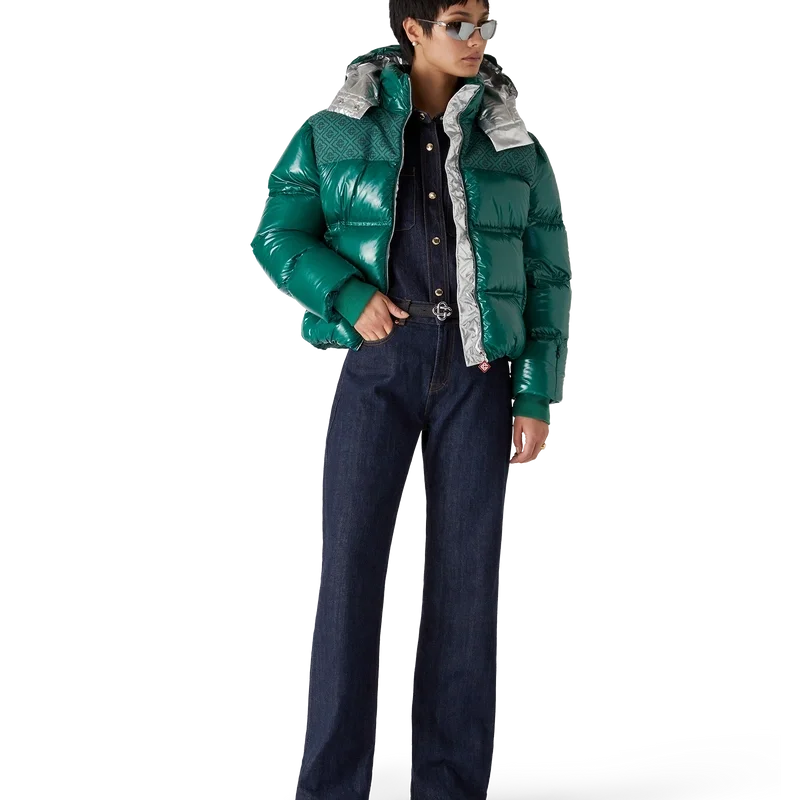Die Nylon-Daunenjacke ist ein modernes, kastenförmiges Design der Oberbekleidung aus Ripstop-Nylon mit Daunenfüllung und kontrastierendem Monogramm-Jacquard-Einsatz über den Schultern. Abgerundet wird sie durch eine Kapuze mit Cc-Logo-Kordelstoppern und Kordelzugverschluss, einen Stehkragen für zusätzliche Wärme und Schutz vor den Elementen, einen Reißverschluss mit dem charakteristischen Diamant-Logo-Reißverschlusszug des Hauses, Fronttaschen mit Reißverschluss, verstellbare Manschettenbänder mit Markenlogo sowie einen elastischen Saum und elastische Manschetten.
