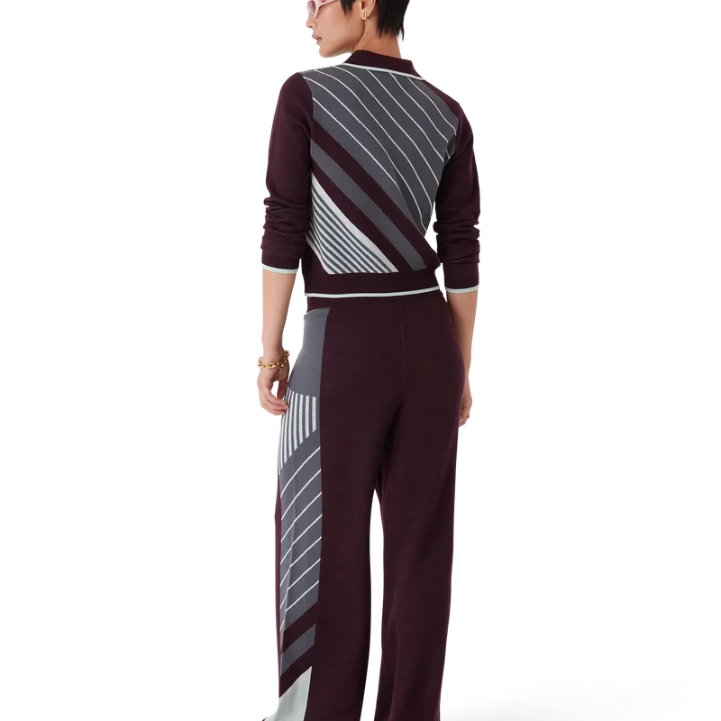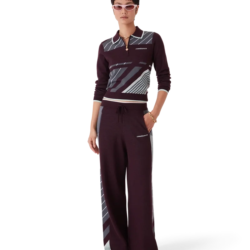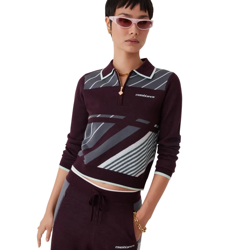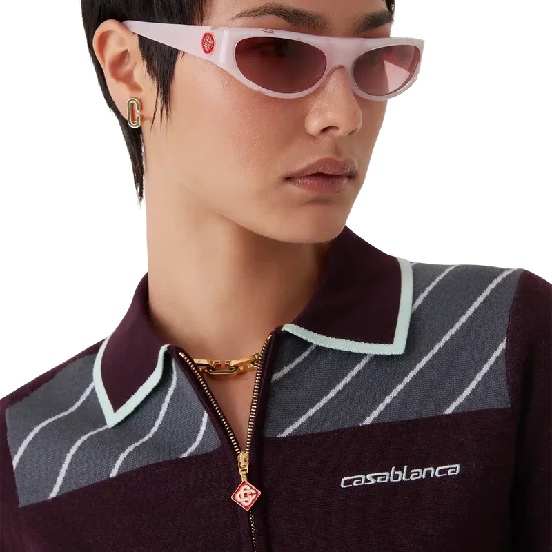 Das Diagonal Tennis Merino Langarm-Poloshirt ist ein Strickmodell mit diagonalen Sportstreifen und einem gestickten Casablanca-Logo. Abgerundet wird es durch einen Viertelreißverschluss mit charakteristischer Reißverschlusslasche mit Diamant-Logo, einen gerippten Kragen sowie kontrastfarbene Kanten an Kragen und Manschetten.