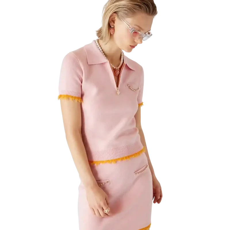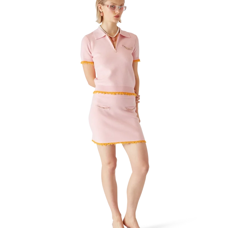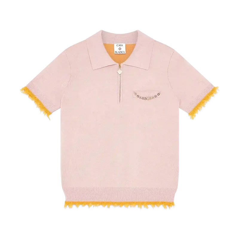 Das Poloshirt ist ein kurzärmeliges Modell aus Merinowolle mit klassischer Silhouette und Taschen. Es verfügt über einen gerippten Kragen, einen Reißverschluss mit dem charakteristischen Diamant-Logo des Hauses, eine aufgesetzte Brusttasche, gerippte Bündchen und einen Saum mit ausgefransten Kanten sowie eine lockere Passform mit raffinierter Verarbeitung.