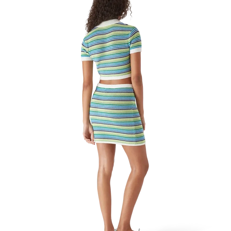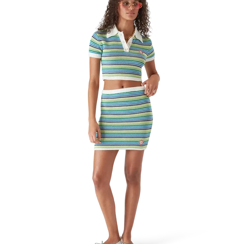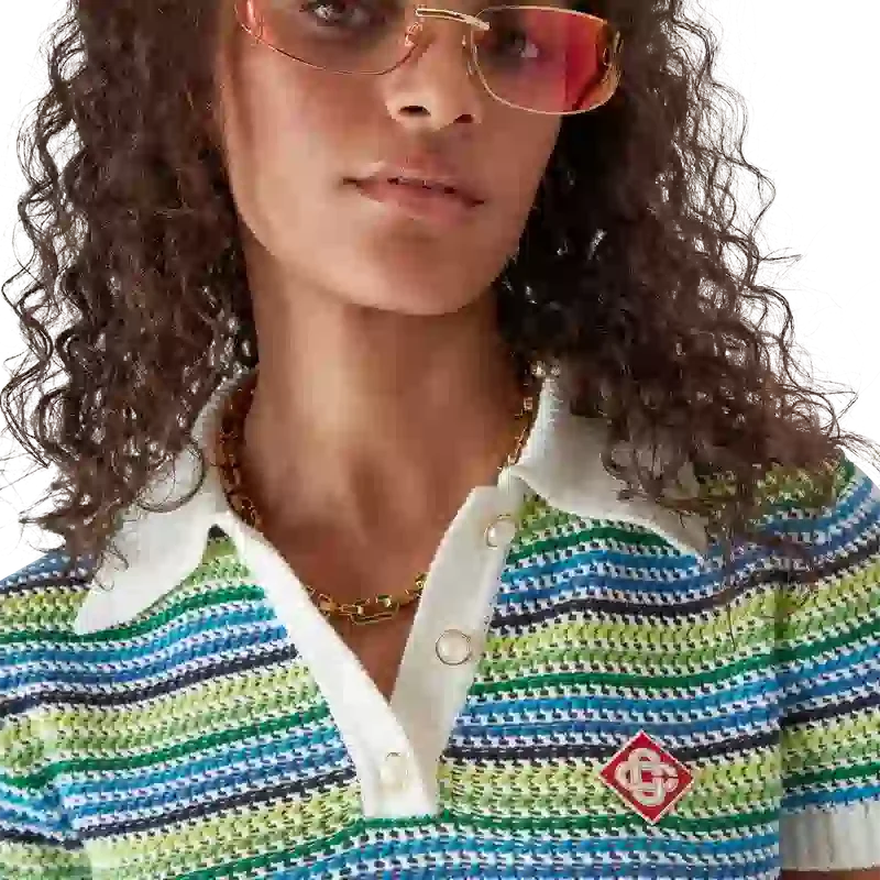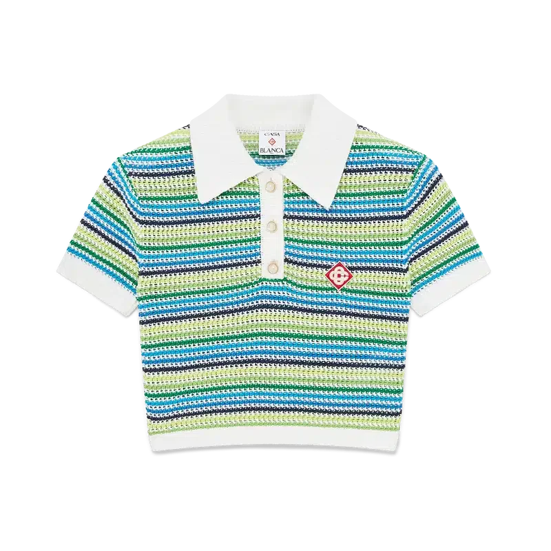 Das gestreifte Polohemd ist ein kurzes Modell mit kurzen Ärmeln und dem charakteristischen Rautenlogo des Hauses. Es besticht durch gestreiften Strickstoff, eine Knopfleiste, die charakteristischen goldgeränderten Perlmuttknöpfe sowie gerippte Details an Kragen, Ärmelbündchen und Saum.