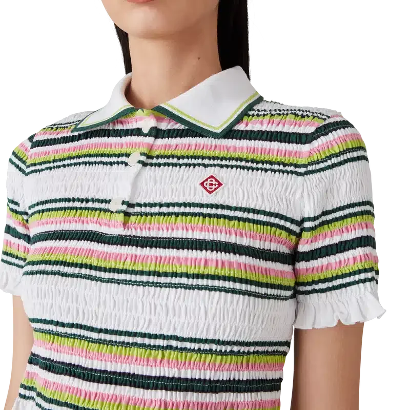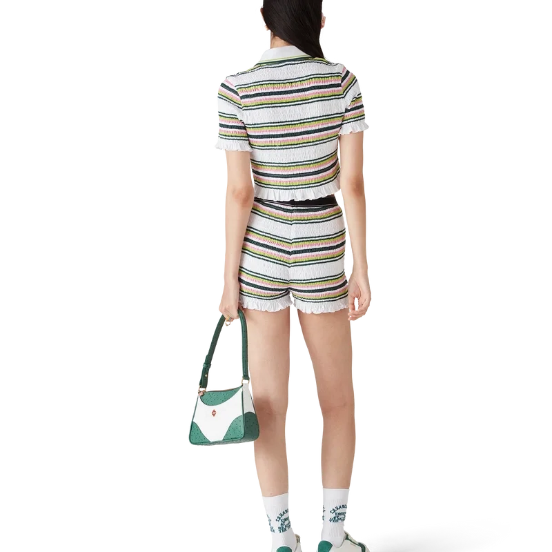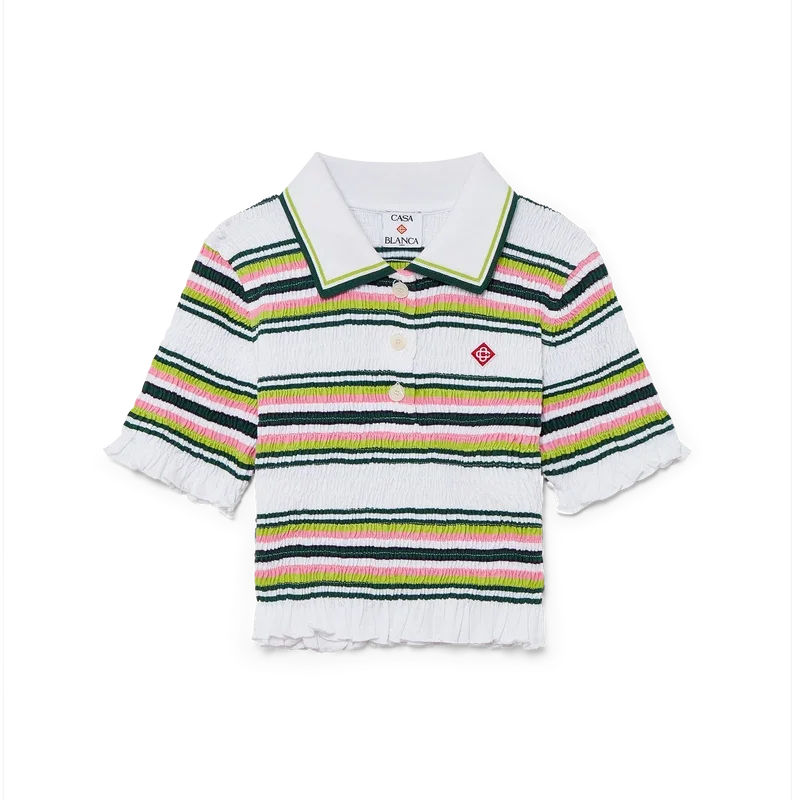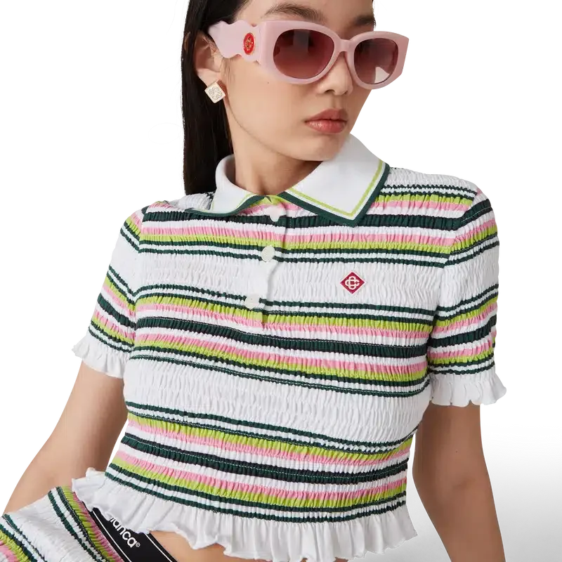 Das gestreifte, verkürzte Poloshirt ist ein kurzes Modell mit dem charakteristischen Rautenlogo des Hauses. Es ist aus gerafftem Baumwollstoff gefertigt und verfügt über einen gerippten Kragen mit gestreiften Kanten, eine Knopfleiste mit drei Knöpfen, kurze Ärmel sowie Rüschen an den Ärmelbündchen und am Saum. Es ist so geschnitten, dass es oberhalb des Bauchnabels sitzt.