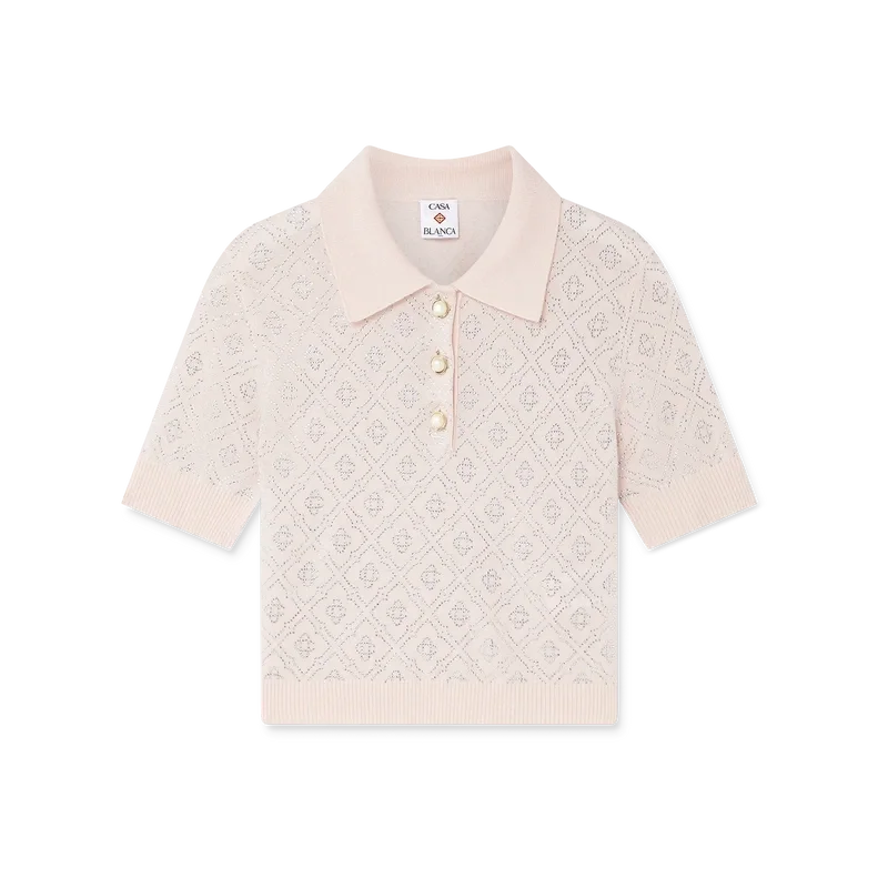Das Crystal Monogram Strick-Poloshirt ist ein kurz geschnittenes Modell aus Merinowolle und ziert das Crystal Monogram des Hauses. Es ist mit den charakteristischen goldumrandeten Perlknöpfen sowie einem gerippten Kragen, Ärmelbündchen und Saum versehen – so geschnitten, dass es oberhalb des Bauchnabels sitzt.