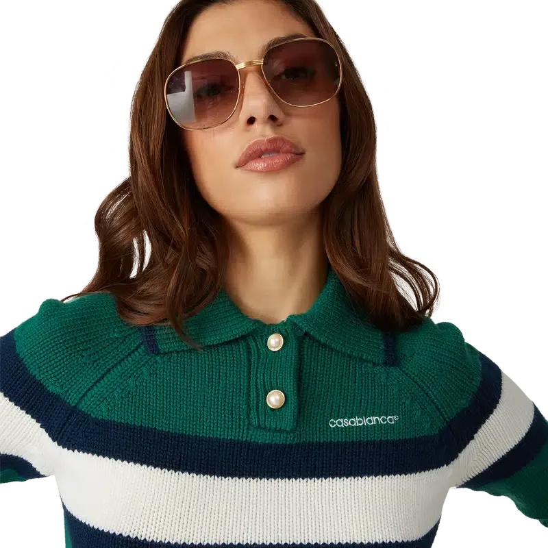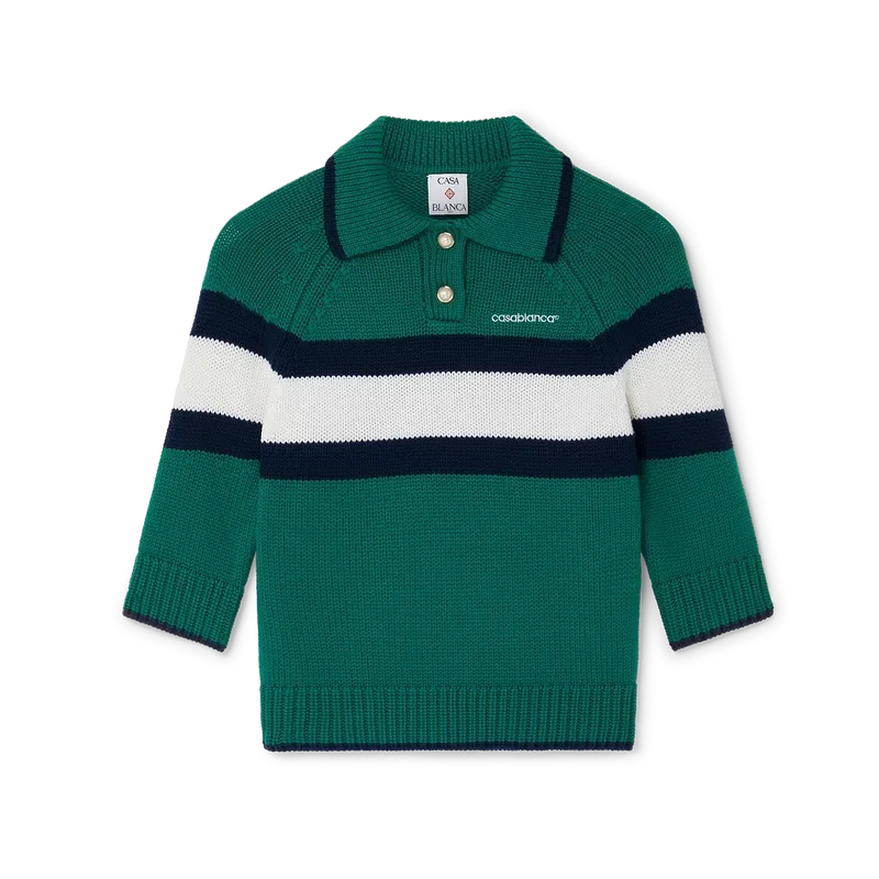 Das Colour-Block-Poloshirt ist ein kurz geschnittenes Langarm-Modell aus Merinowolle mit einem blau-weißen Streifen über Brust und Rücken. Abgerundet durch Raglanärmel, gerippte Bündchen, Saum und Kragen, charakteristische goldgerahmte Perlmuttknöpfe und das Casablanca-Logo.<!–