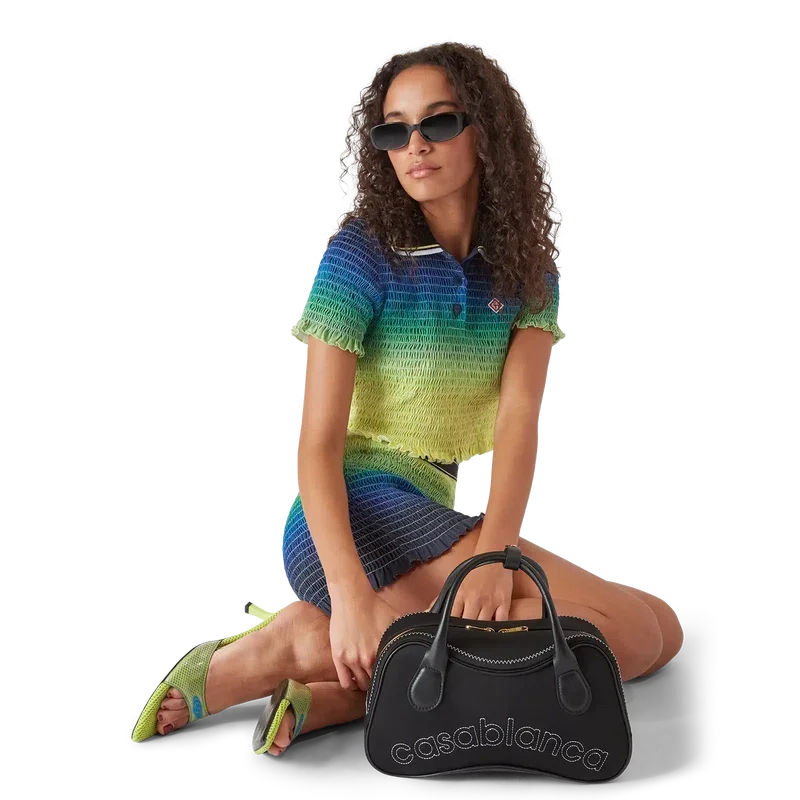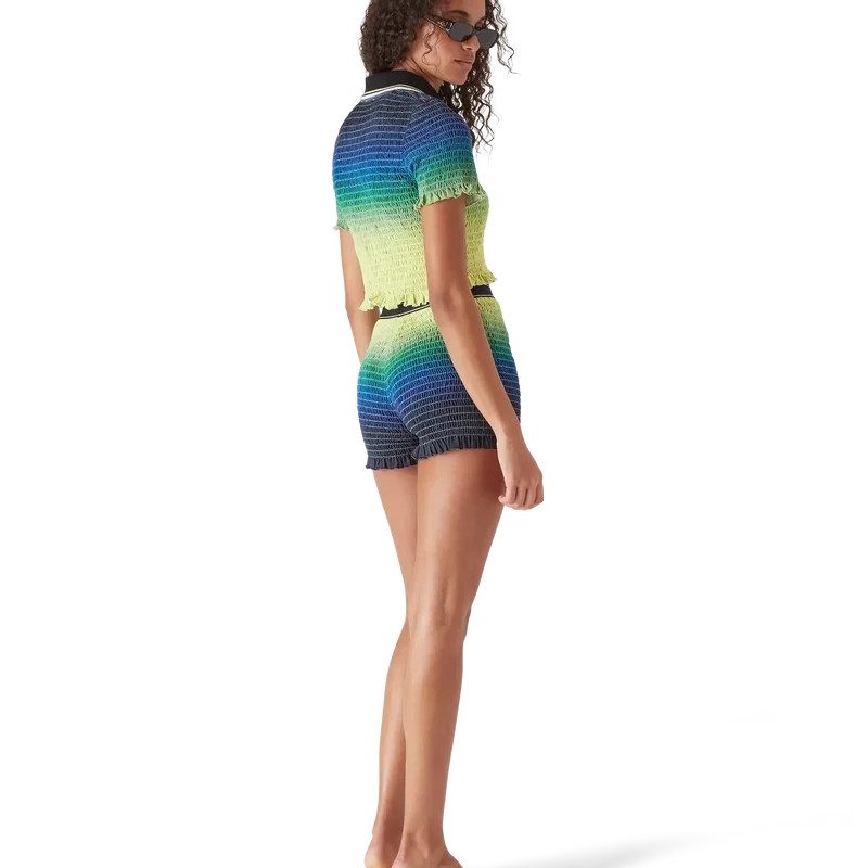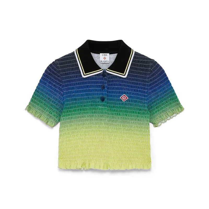 Das Poloshirt mit Farbverlauf und Rüschen ist ein kurz geschnittenes Modell mit dem saisonalen Farbverlauf und dem charakteristischen Rautenlogo des Hauses. Es verfügt über einen gerippten Kragen, kurze Ärmel, eine Knopfleiste mit drei Knöpfen sowie Rüschen an den Ärmelbündchen und am Saum. Es ist so geschnitten, dass es oberhalb des Bauchnabels sitzt.