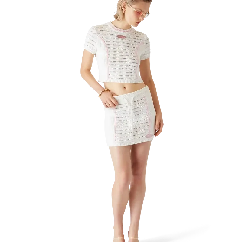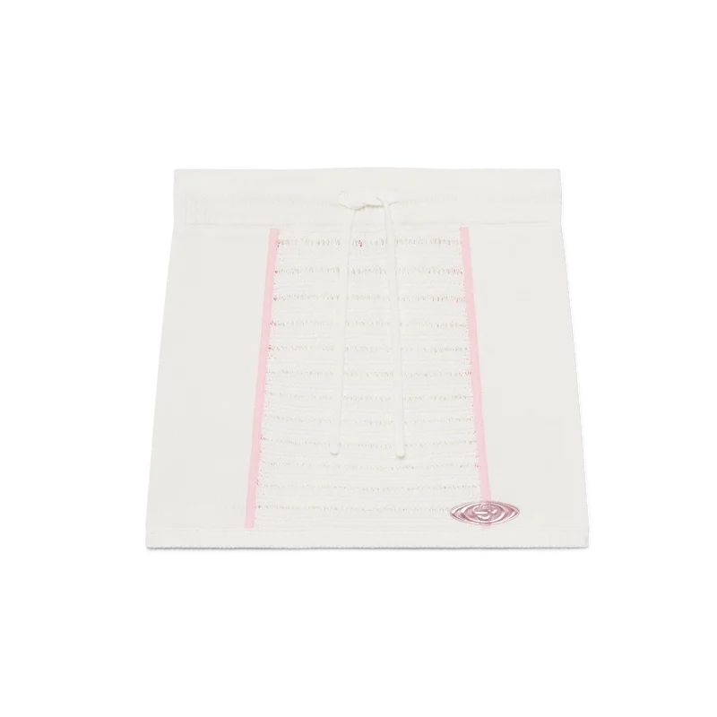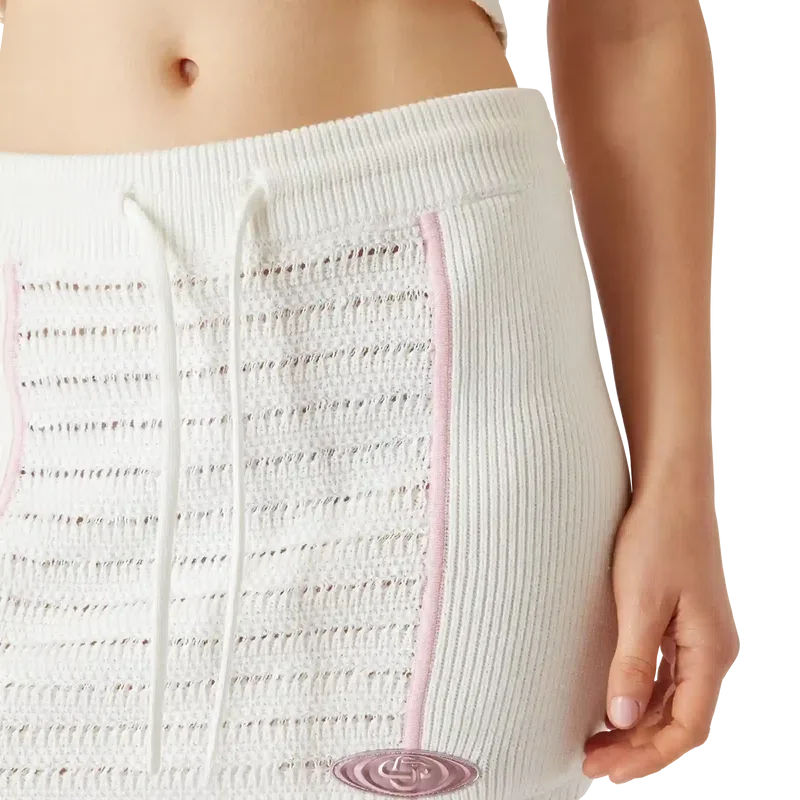 Der Bourgeoisie Girl Rock ist mit einem leicht ausgestellten A-Linien-Saum gestaltet und mit dem Warped-Logo des Hauses in einem glasartigen Effekt versehen. Das Kleidungsstück wurde zum Tragen mit dem passenden Bourgeoisie Girl Oberteil entworfen und spiegelt eine präzise Konstruktion mit gehobener Sport-Freizeit-Ästhetik wider. Abgerundet wird es durch einen elastischen Bund, einen Kordelzugverschluss, kontrastierende Ziernähte und gerippte Seiteneinsätze.