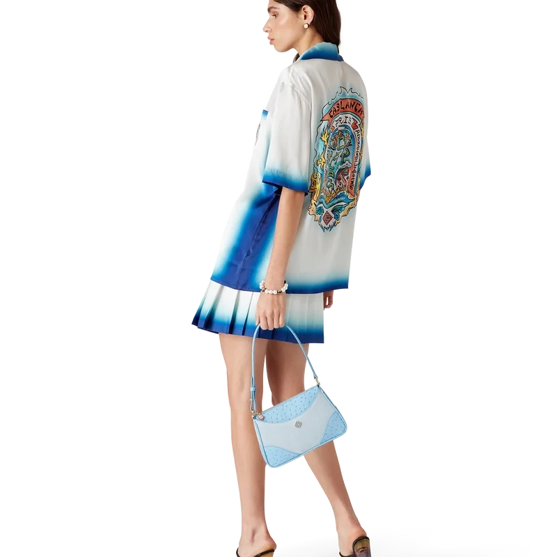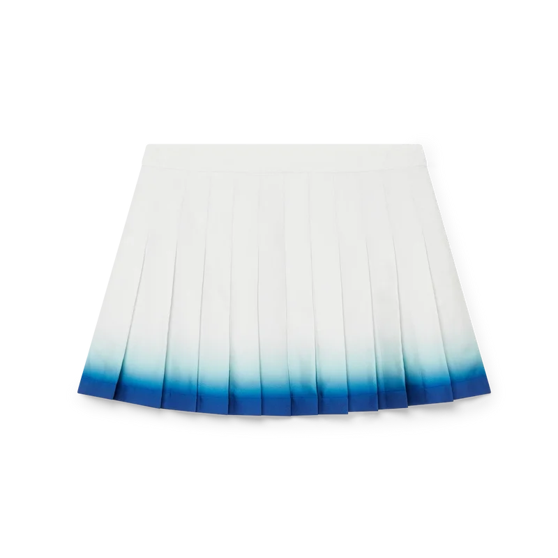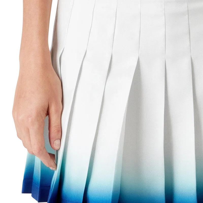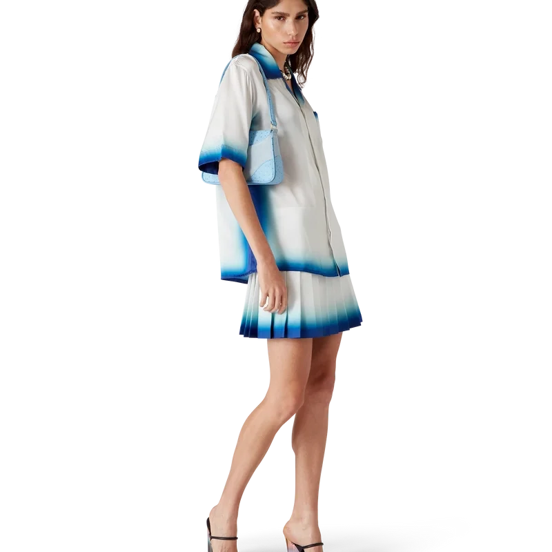 Der Casa Way Skate Plisseerock ist ein kurzer Rock aus Seidentwill. Mit Bund, Falten, einem blauen, horizontal verlaufenden Farbverlauf am Saum, seitlichem Reißverschluss und Futter.