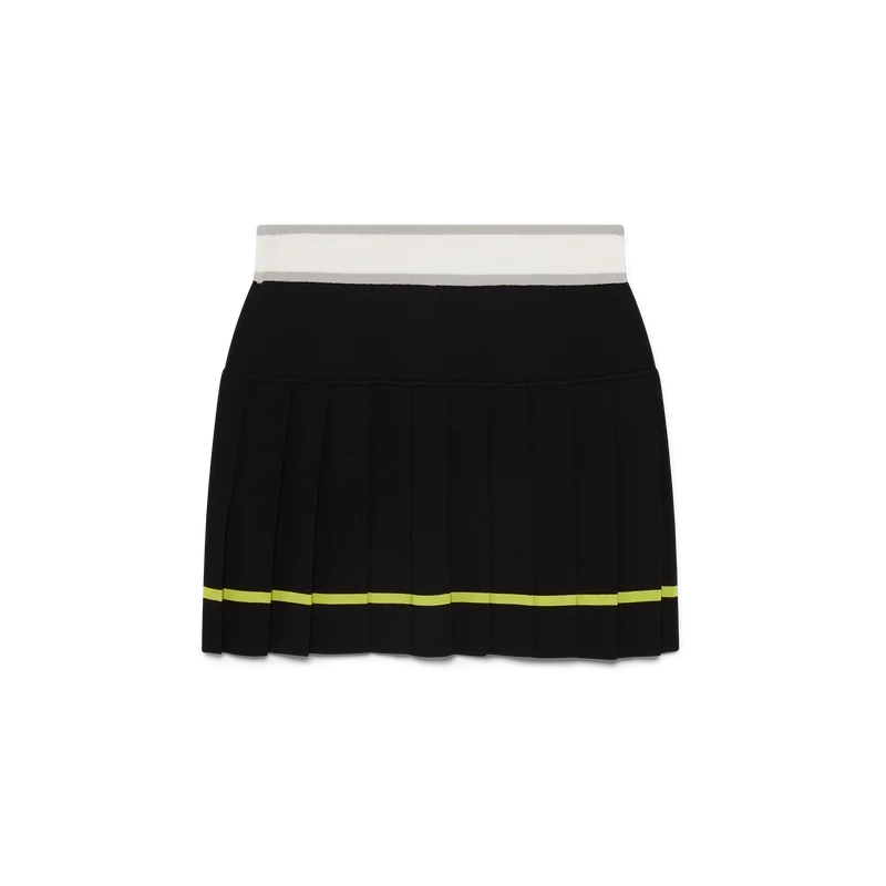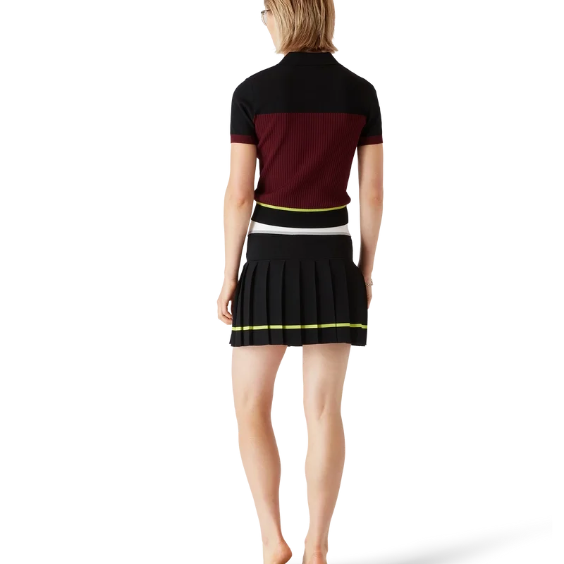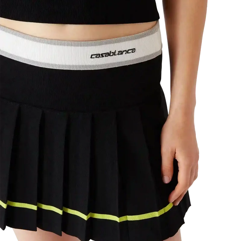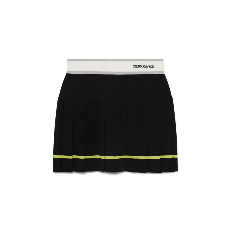 Der gestreifte Faltenrock ist ein Modell im Mini-Stil mit einer strukturierten Silhouette, die den Atelier-Ansatz des Hauses in Bezug auf Sportbekleidung widerspiegelt. Abgerundet durch einen elastischen Bund mit dem Casablanca-Logo, ein einfarbiges Passe-Detail und einen Faltenbereich mit gelben Streifen am Saum.