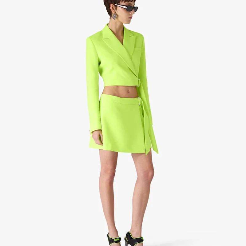 Der grüne Crêpe-Minirock ist ein raffiniertes A-Linien-Cross-Over-Design in einem leuchtenden Grünton. Abgerundet durch einen strukturierten Bund, einen Gürtelverschluss und eine versilberte Schnalle.
