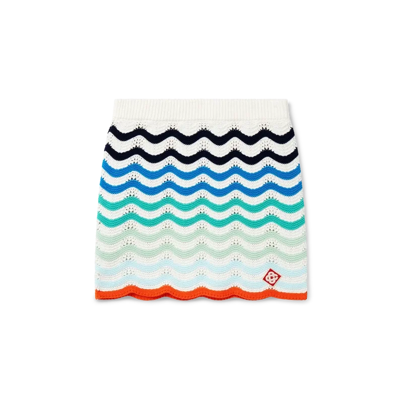Der Gradient Wave Crochet Rock ist ein Minirock aus einem Baumwollstoff mit Wellenmuster im Farbverlauf, der das vom Memphis-Stil inspirierte Designelement des Hauses in Farbverläufen aufgreift und damit an das Reise- und Urlaubsthema der Kapselkollektion anknüpft. Abgerundet wird er durch einen gerippten Bund und kontrastierende Kanten am Saum.