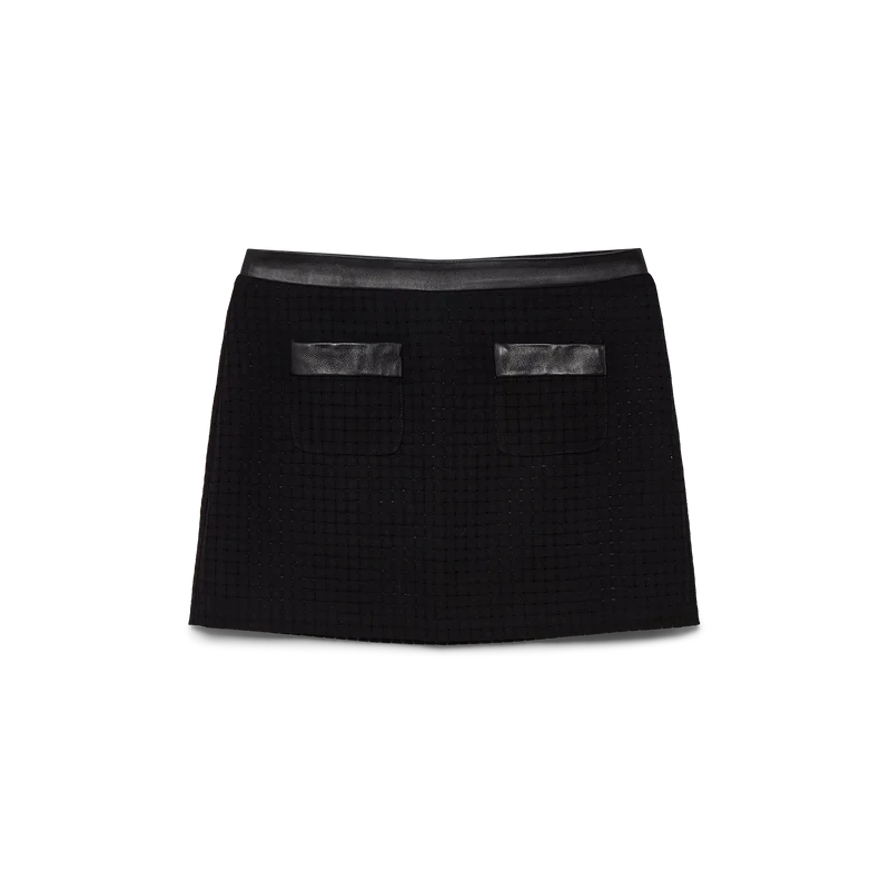 Der taillierte Minirock mit offener Webart ist ein A-Linien-Modell aus Cordonetto-Stoff. Mit Reißverschluss, aufgesetzten Taschen und Lederbesatz an Bund und Taschen.